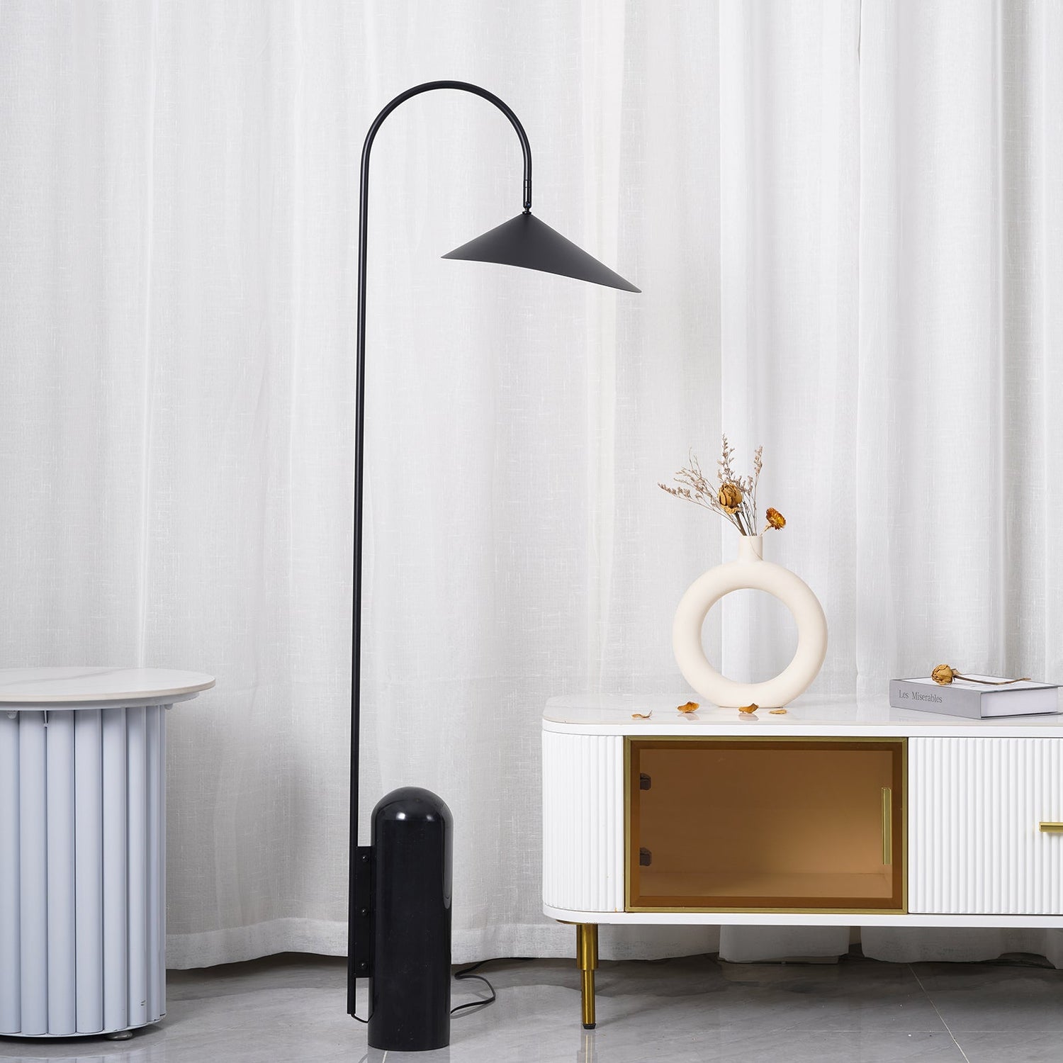 The Arum Floor Lamp is characterized by the black solid marble base combined with the organically shaped lampshade. Achieving the perfect balance in the off-center structure of the lamp, the black marble foot counterweighs the gentle way the lampshade is suspended from the curved metal arch in a leaf-like manner. With the matte, off-white inside of the shade, the lamp provides a soft, evenly distributed light, and the lampshade can be adjusted to ensure optimal light conditions in all situations.
