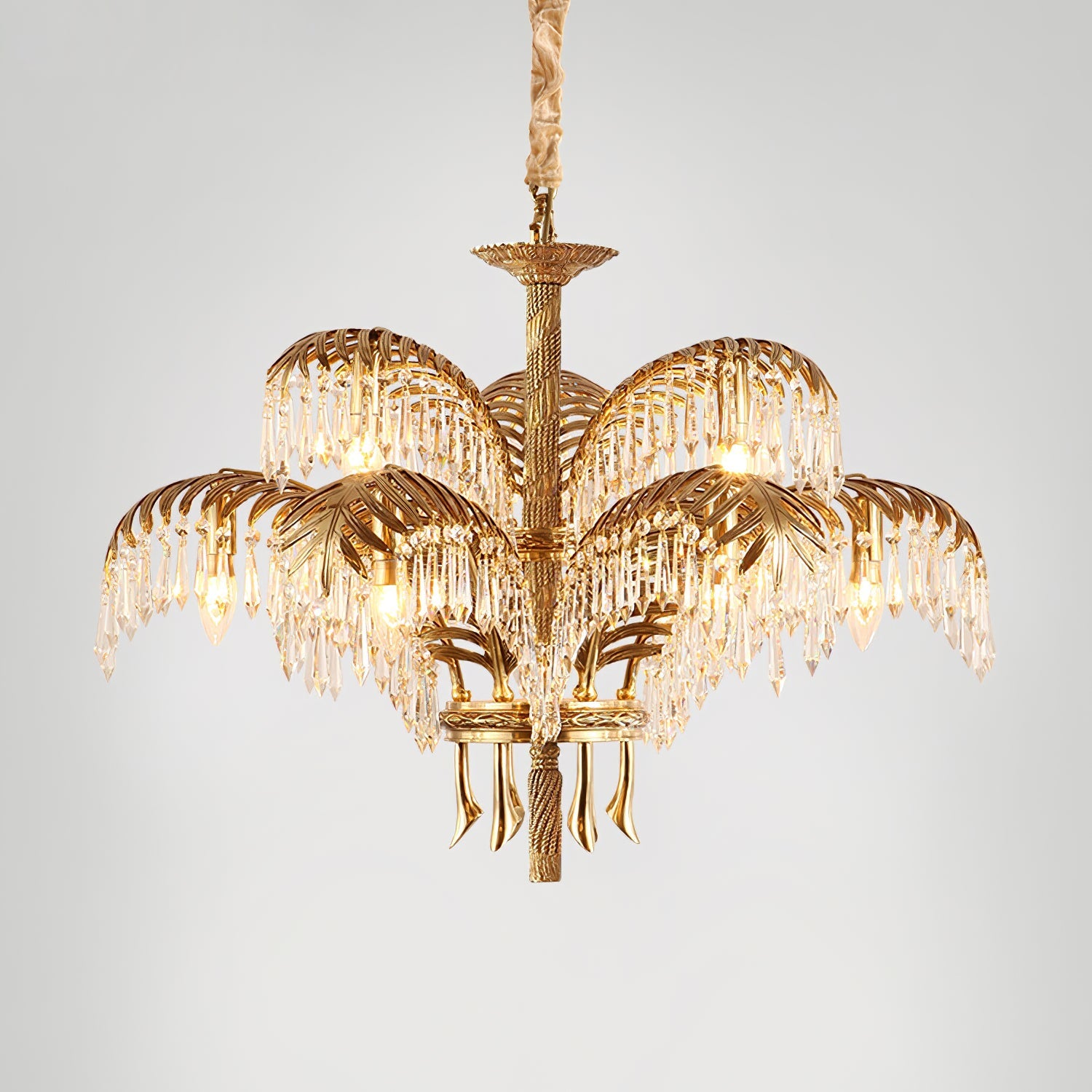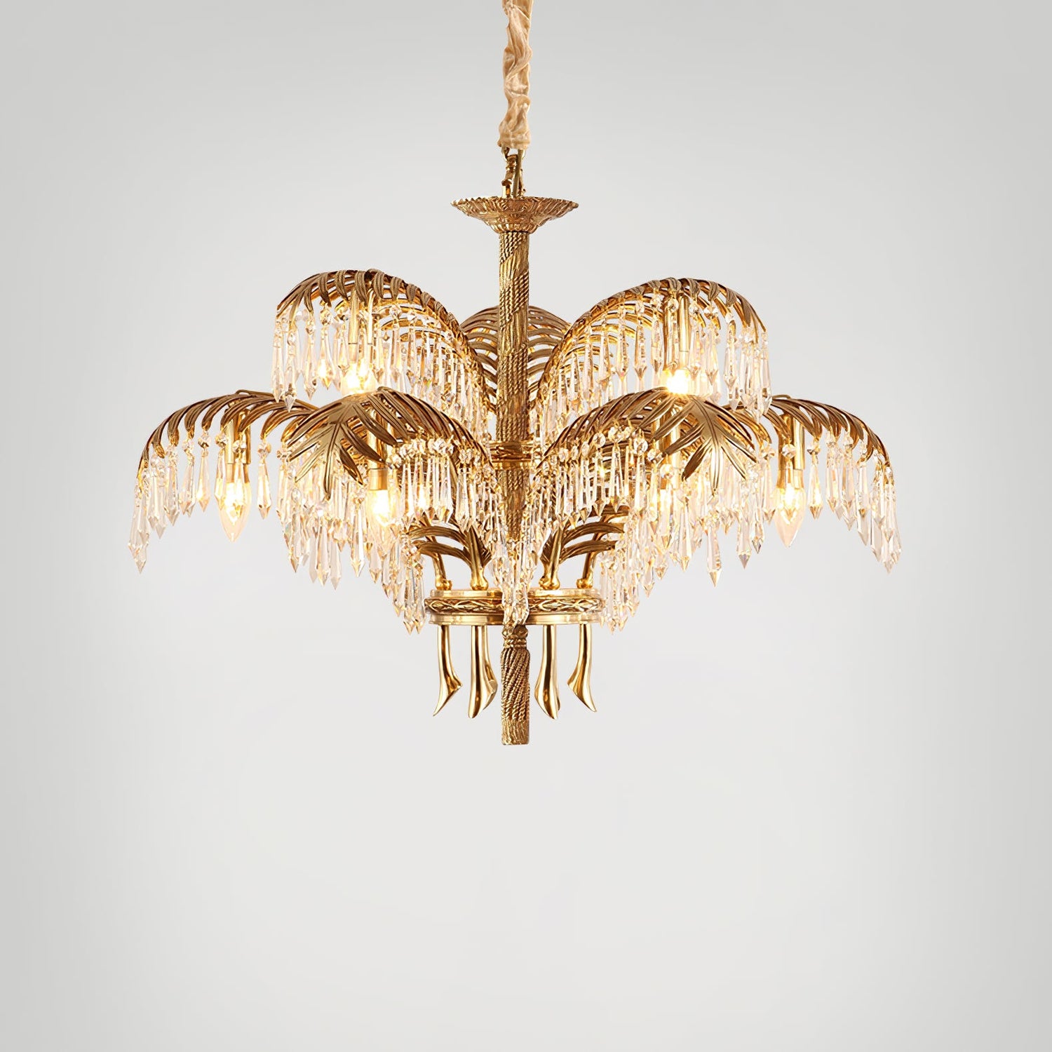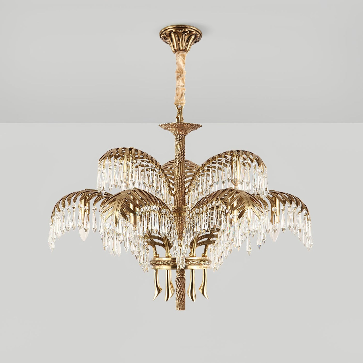 Experience the luxurious craftsmanship of our Brass Palm Leaf Crystal Chandelier. Handmade with Italianate influences, each delicate leaf is intricately crafted from brass wire. The warm brass finish adds a touch of elegance while maintaining a light and airy feel. Elevate any space with this stunning chandelier.