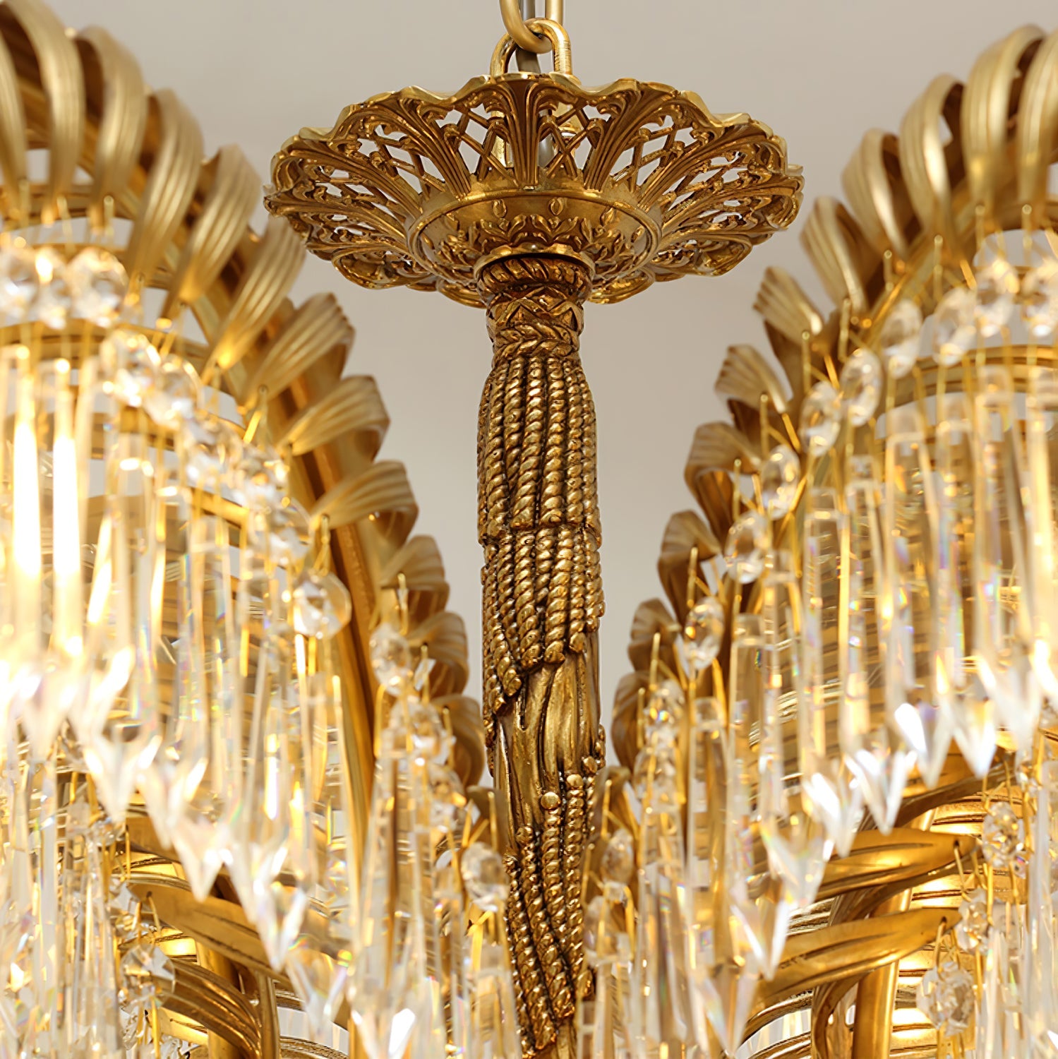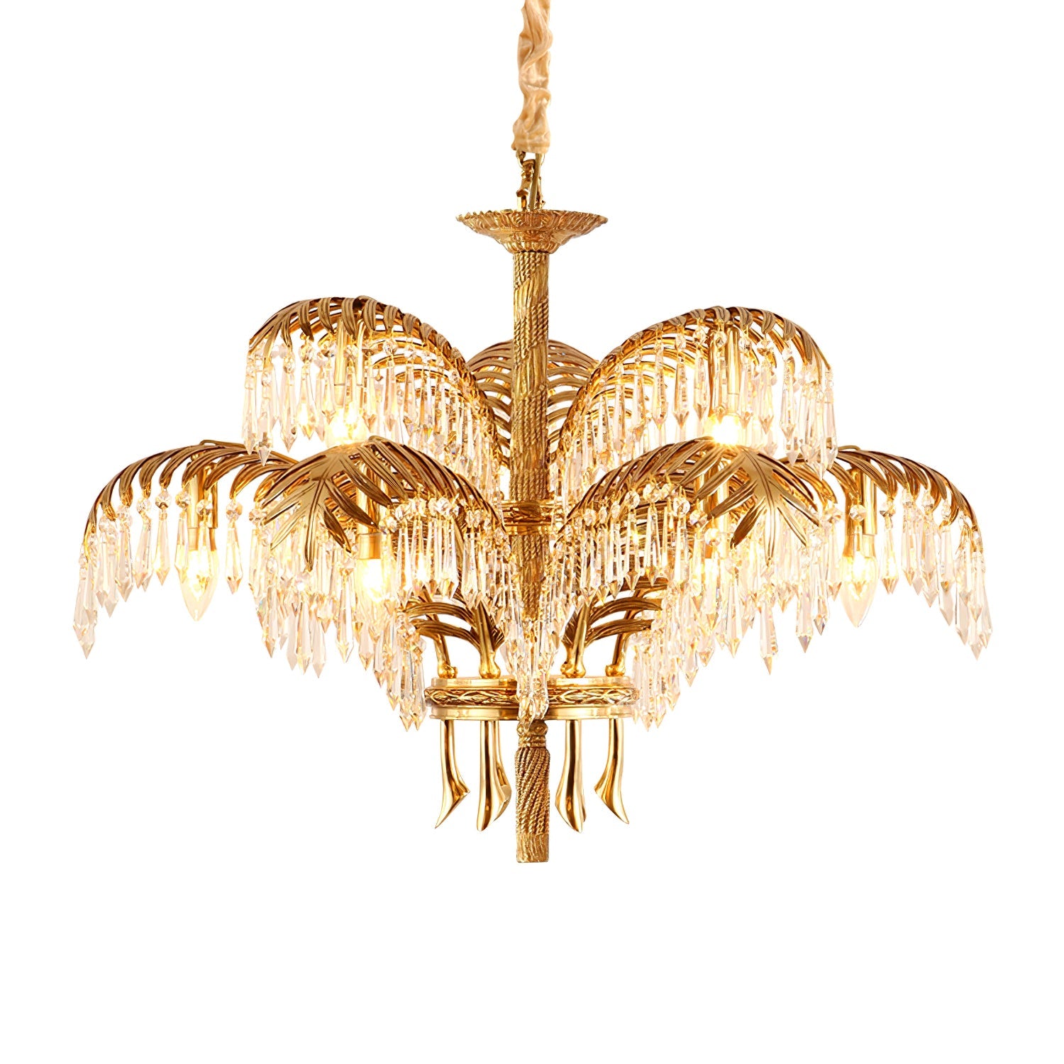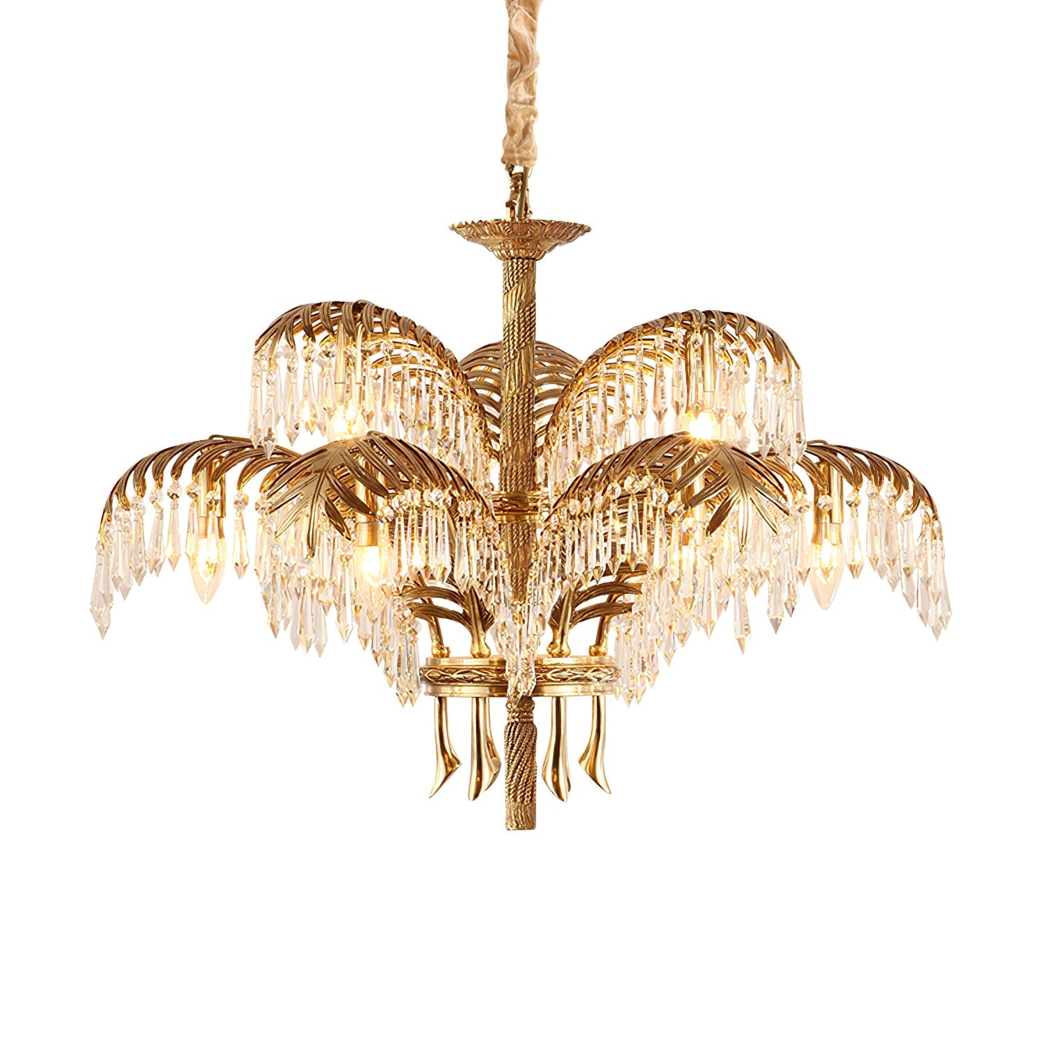 Experience the luxurious craftsmanship of our Brass Palm Leaf Crystal Chandelier. Handmade with Italianate influences, each delicate leaf is intricately crafted from brass wire. The warm brass finish adds a touch of elegance while maintaining a light and airy feel. Elevate any space with this stunning chandelier.