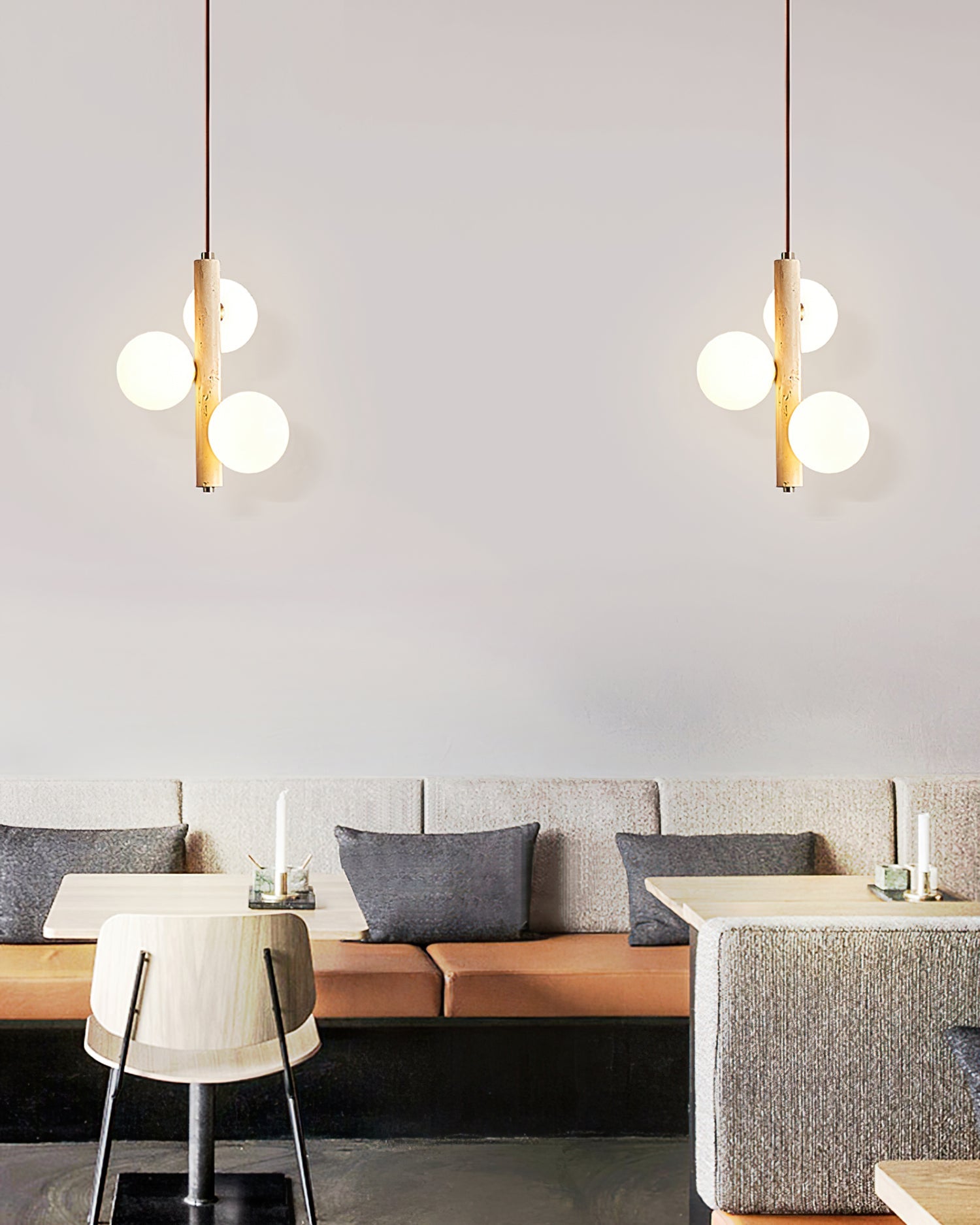 This Bubble Ball Pendant Lamp features a unique design with a yellow travertine lamp stand and glass lampshade. The sophisticated combination of materials creates a stunning visual appeal and provides gentle illumination to any space. The perfect addition to elevate any room's style.