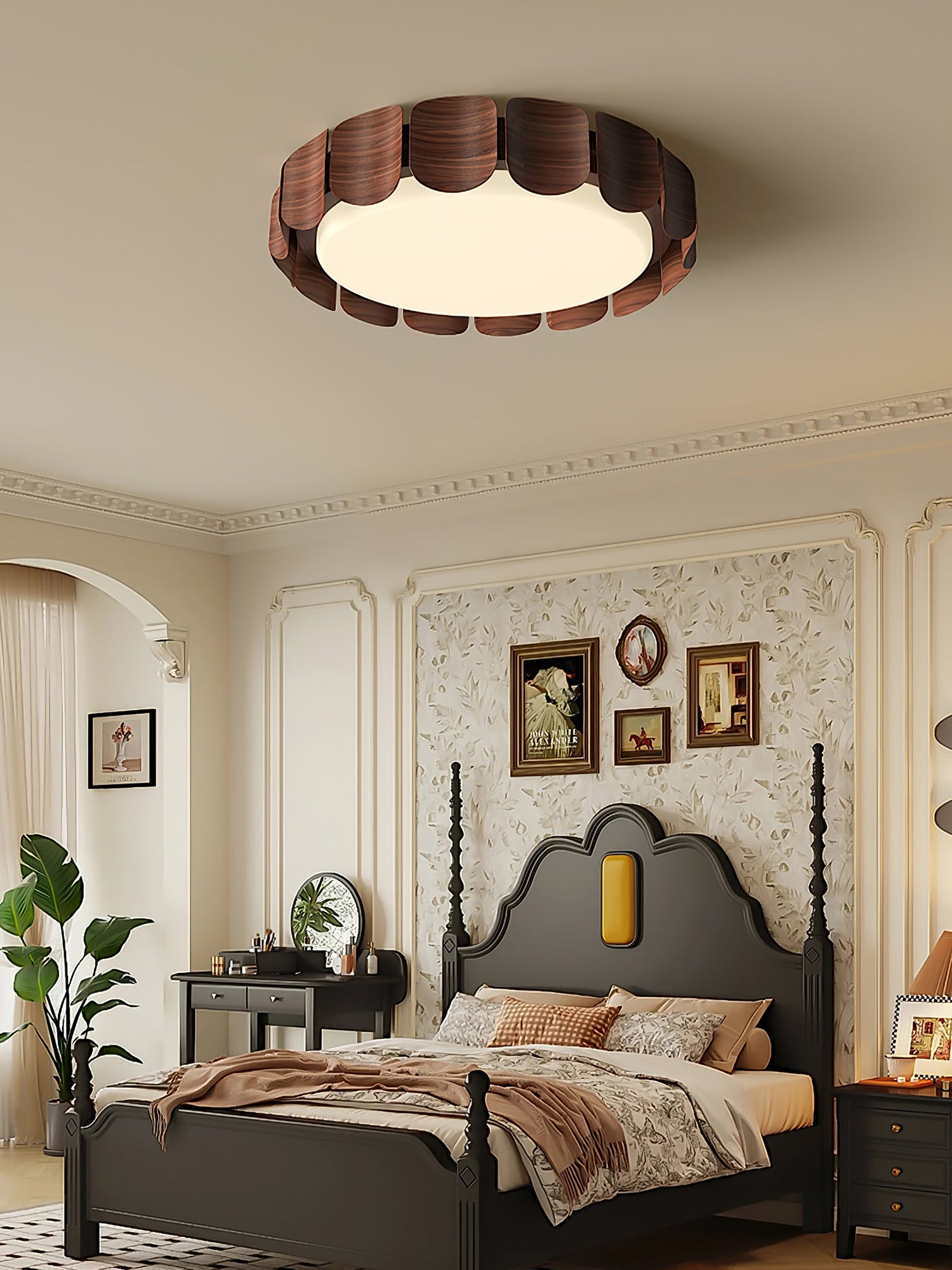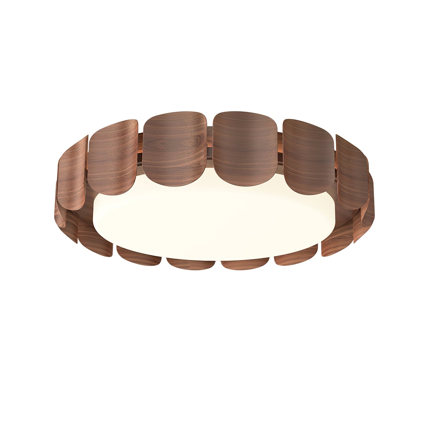 The Cascadia Flare Ceiling Light elegantly combines modern aesthetics with functional brilliance. Crafted with precision, this light fixture features a distinctive array of curved metal panels finished with a walnut wood grain effect through advanced hydrographic printing techniques. An acrylic diffuser softens the LED illumination, creating a warm, inviting glow that enhances any interior space. Perfect for contemporary living rooms or chic office environments, this ceiling light is not just a lighting fixture but a piece of art that complements your modern decor.
