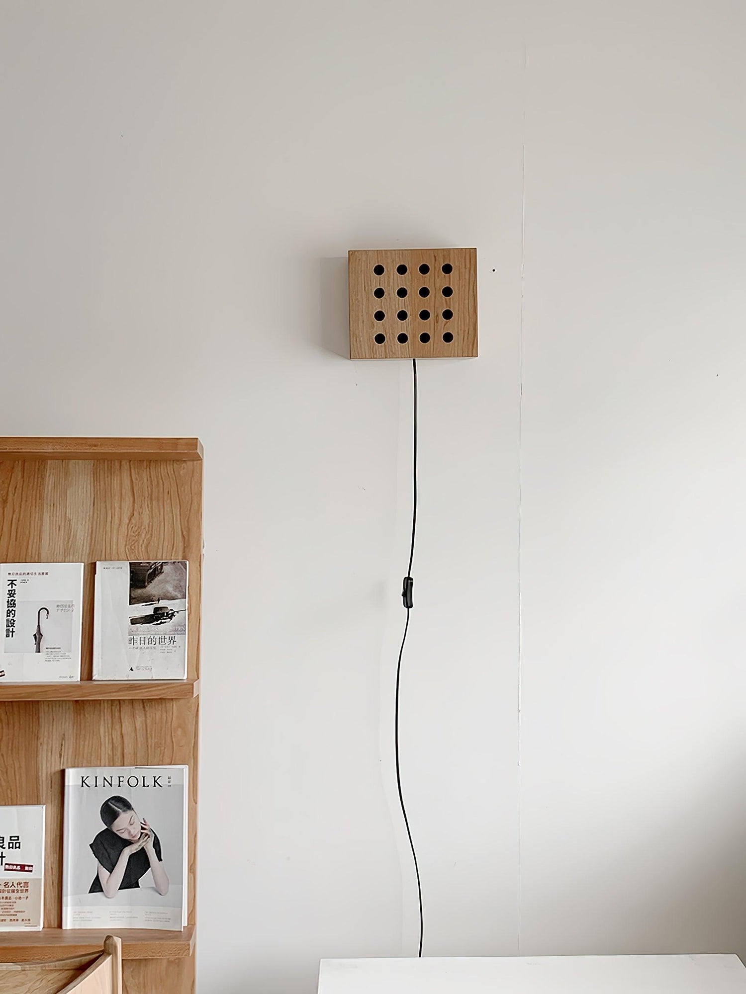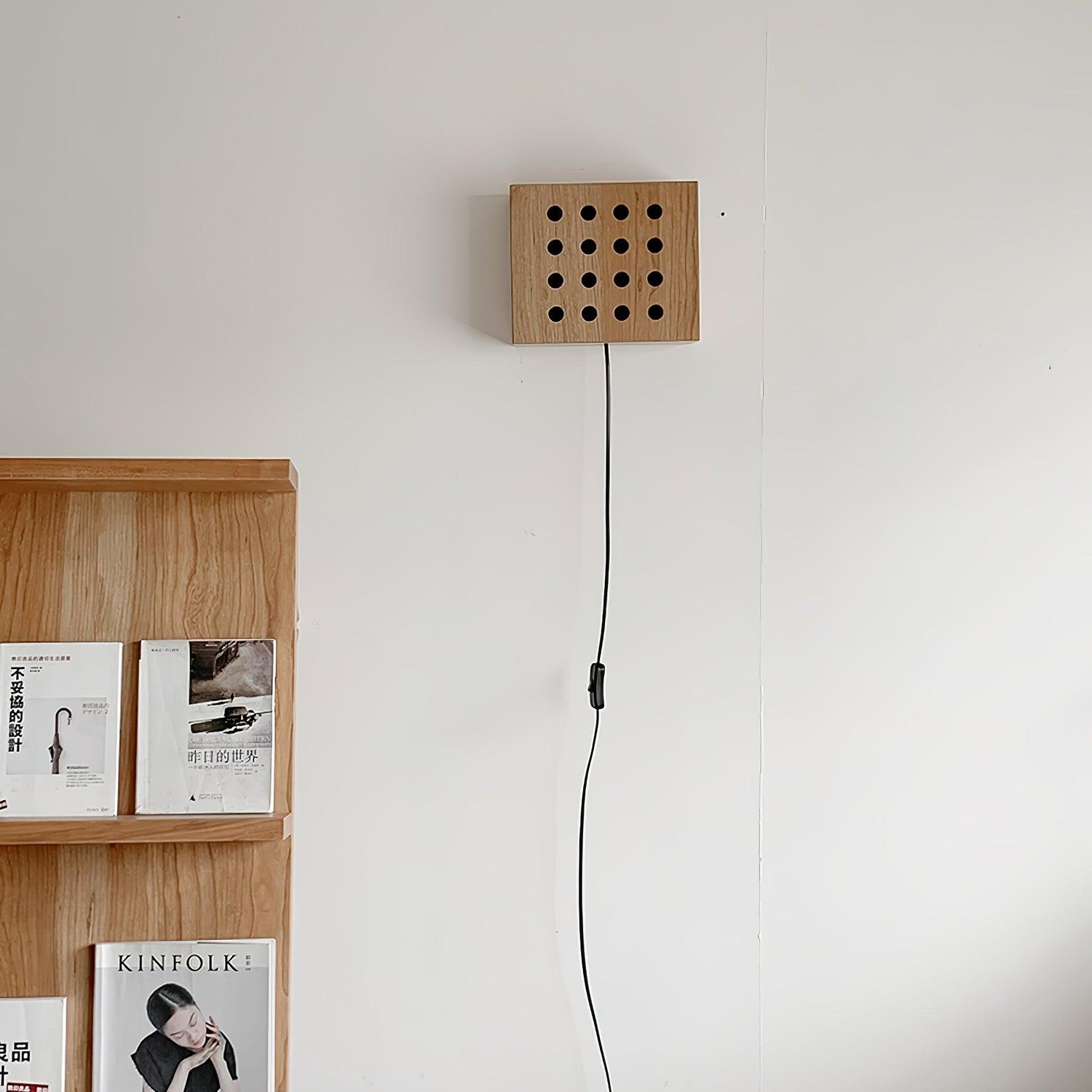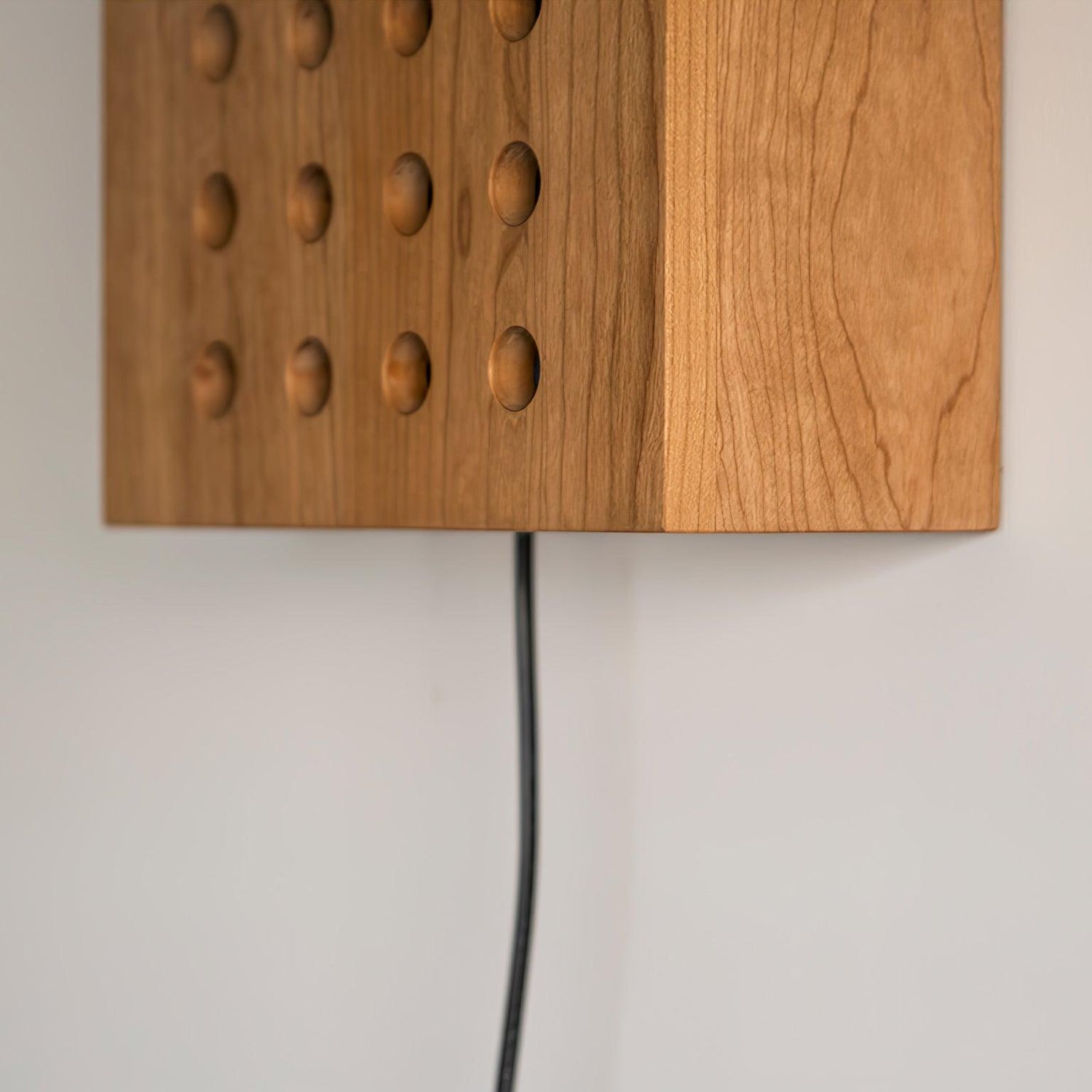 Impeccably crafted from rich cherry wood, this luminaire showcases a grid of round, polished openings, reminiscent of the starry night sky. Each circular cut-out serves as a window, projecting a soft, ambient glow that brings a piece of the heavens into your home. The light diffuses gently through these portholes, creating a soothing atmosphere perfect for relaxation and contemplation. Its clean, square silhouette makes it versatile for various spaces, from cozy reading nooks to sophisticated hallways. The Cherry Lumina Constellation Sconce is a testament to simplicity and elegance, promising to illuminate and inspire.