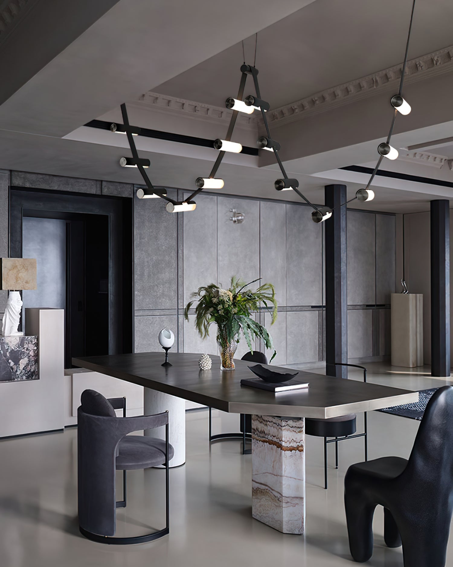 The Curve Leather Chandelier by dekorfine is a masterful blend of modern design and luxurious materials. This striking chandelier features a unique curved structure, elegantly crafted from premium leather and sturdy metal. The sleek, black leather elements provide a sophisticated contrast to the industrial metal components, creating a contemporary aesthetic that stands out in any setting. Perfect for dining rooms, living spaces, or modern offices, the Curve Leather Chandelier adds a touch of elegance and innovation to your decor. Illuminate your space with this exceptional piece from dekorfine's exclusive collection.