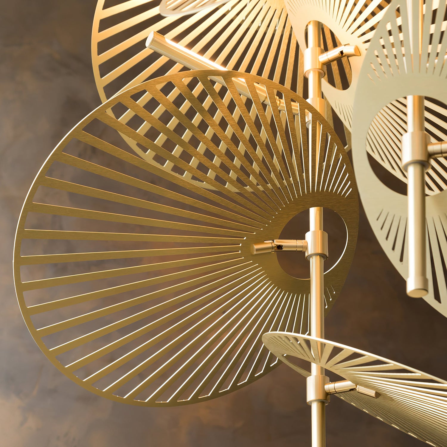 Experience the grandeur of our customizable Leaf Chandelier. Made of anodized gold aluminum, it radiates a warm glow upwards while casting intricate shadows. The integrated LED lights make the brushed finish shimmer in golden tones. With narrow spotlights on the ceiling, it's like walking through a sun-dappled forest.