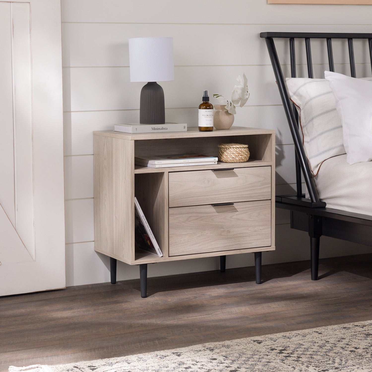 Unveiling the Eadric - Modern Nightstand with Drawers and Shelves in Birch, a harmonious blend of vintage design and modern flair tailored to the contemporary dweller. Beyond its chic aesthetic, Eadric offers a mix of cord management features and spacious storage, making it an essential addition to any bedroom.