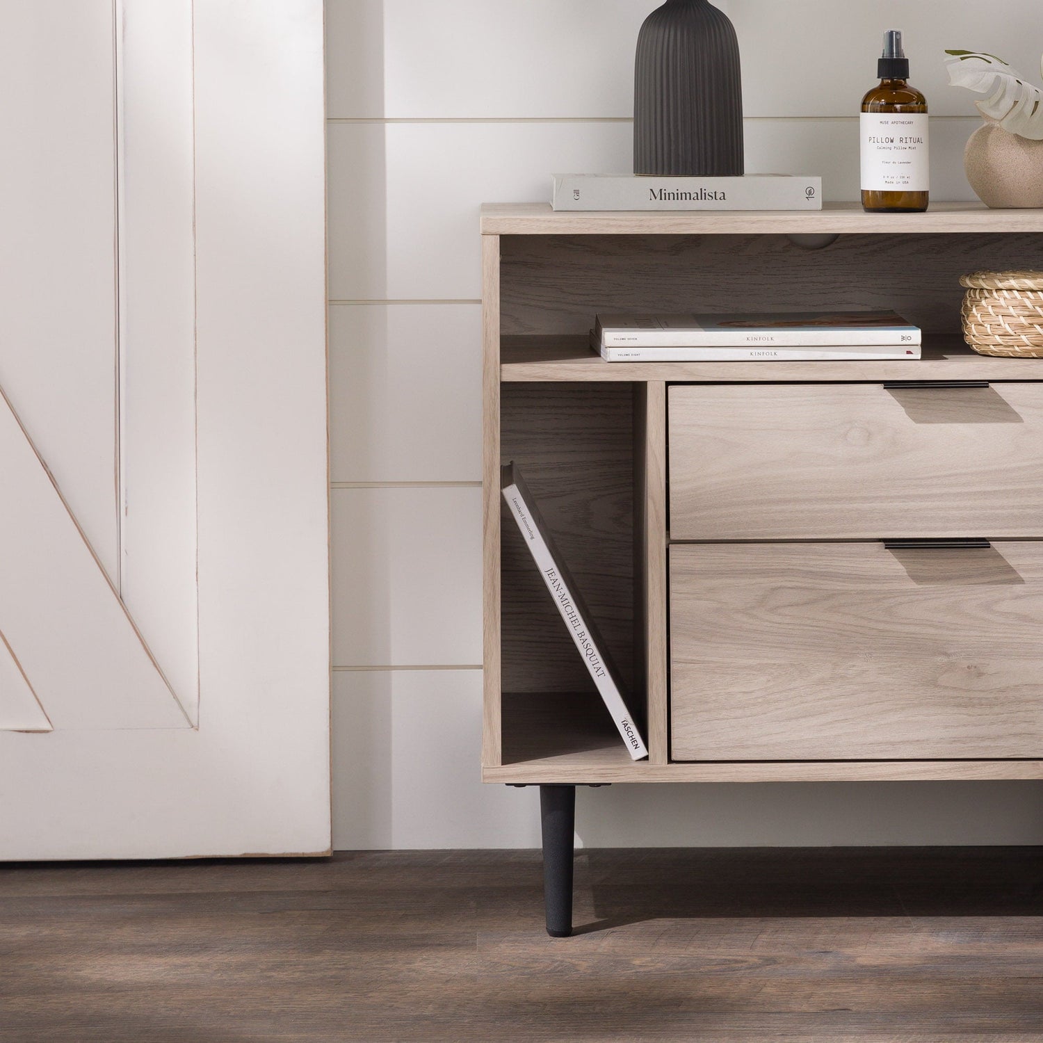 Eadric boasts two smooth-sliding drawers on telescoping metal glides, complemented by two open storage cubbies. These features, coupled with sleek flat metal handles and dedicated cord management holes, promise a clutter-free space and easy access to your essentials.