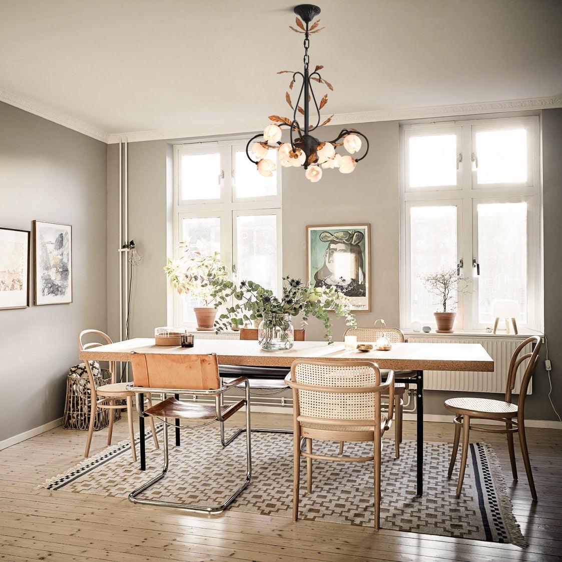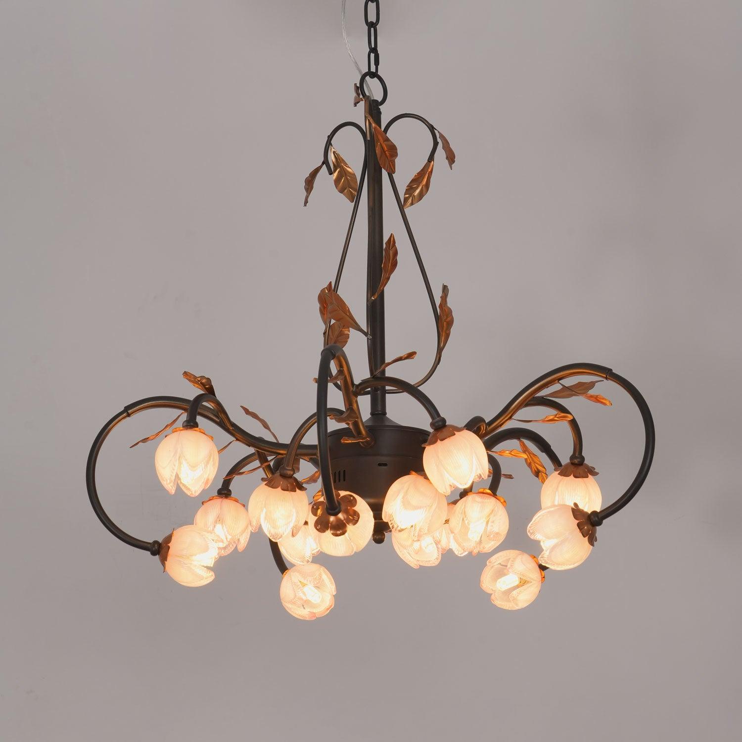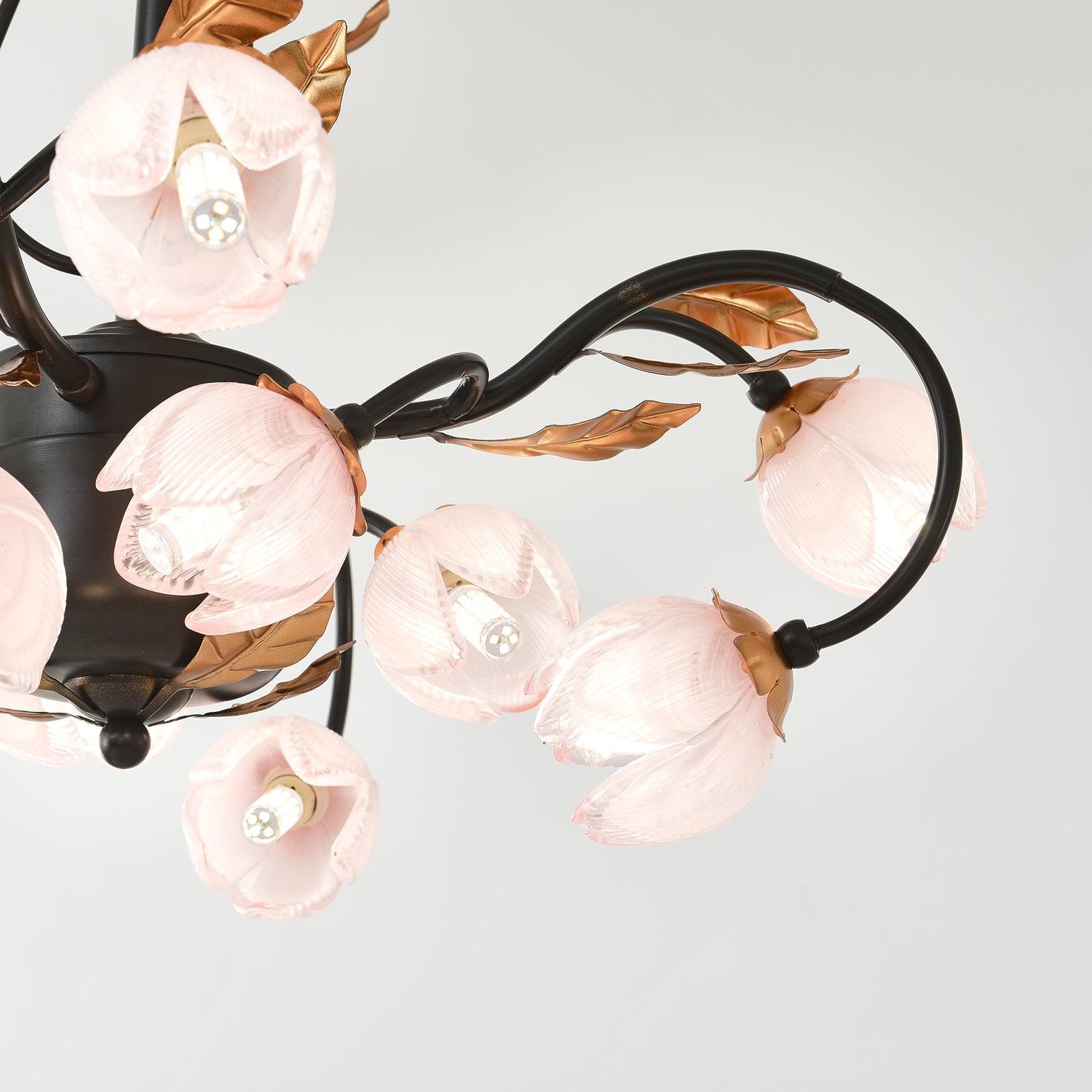 This Eden's Blossom Chandelier offers an elegant and modern look to any room. Its petals and glass construction will give your space a charming, country-style ambiance. Its distinct tulip-shaped lampshade will add a touch of sophistication. Its design is inspired by the lushness of a secret garden with intertwined branches that curve elegantly to cradle blossoms of light. The metalwork, finished in a rustic hue, evokes the wild beauty of nature, while the glass flowers diffuse a soft, enchanting glow, creating an alluring ambiance in any space it adorns. This chandelier is a testament to the timeless appeal of nature-inspired designs, bringing a piece of the outdoor serenity into the modern home.