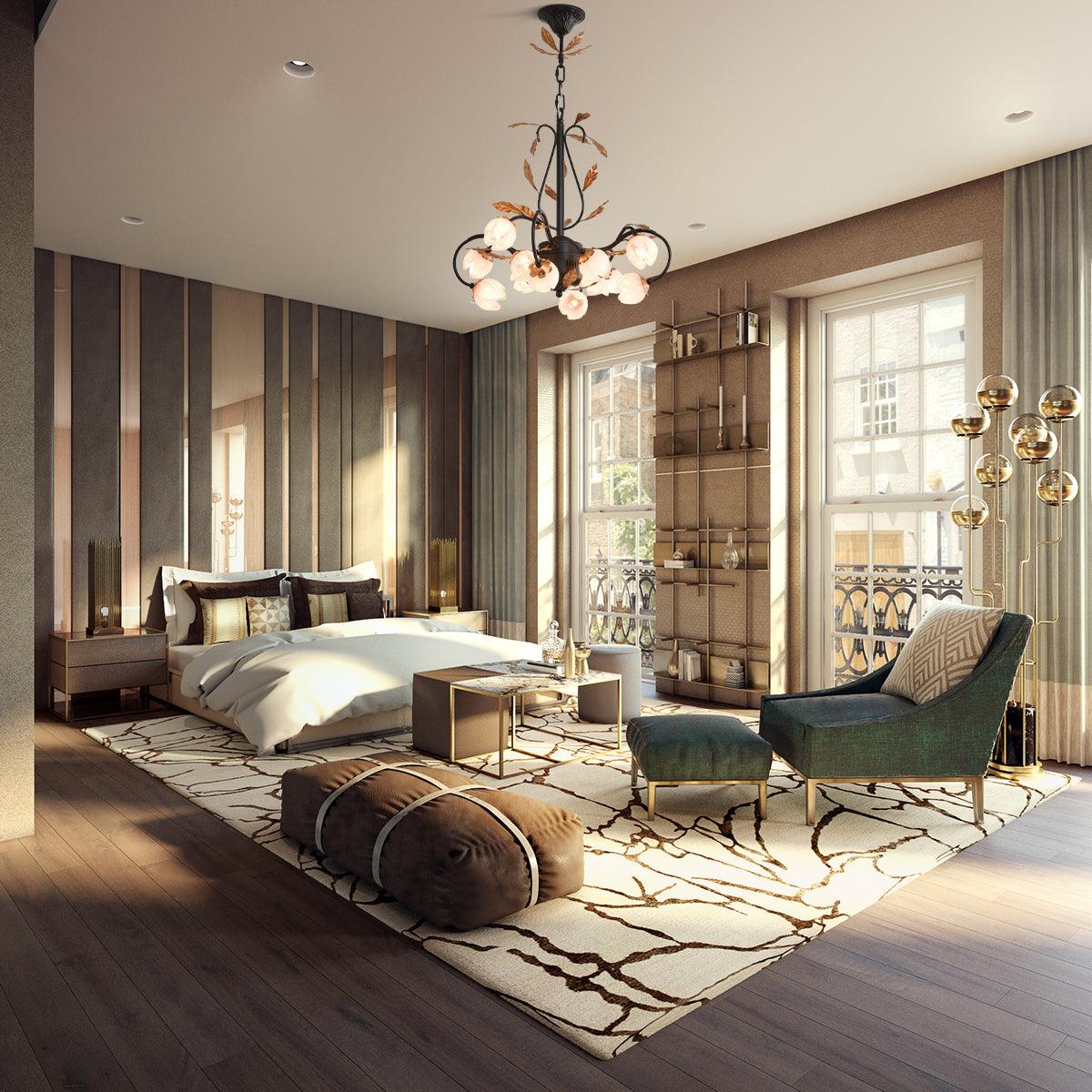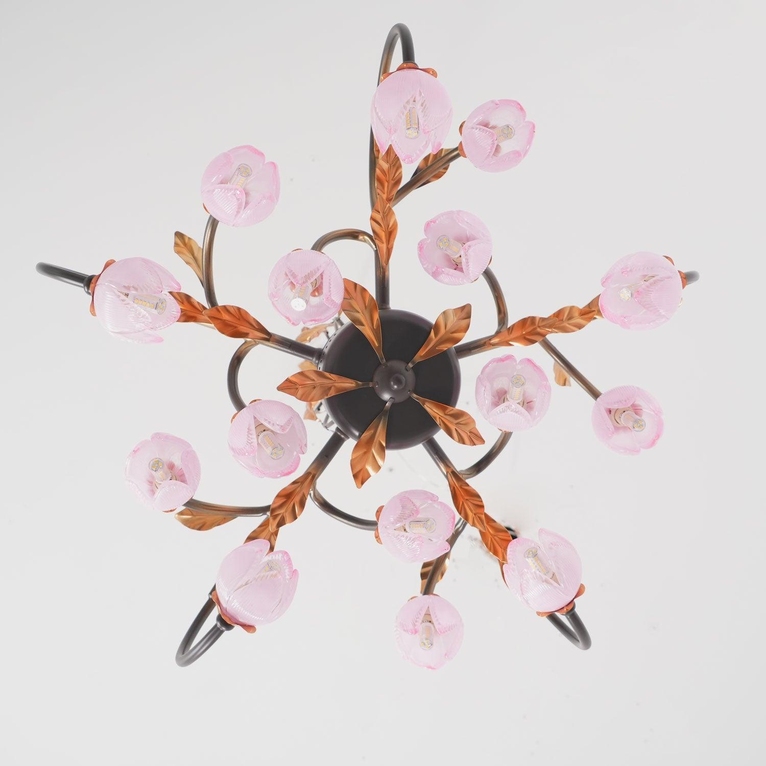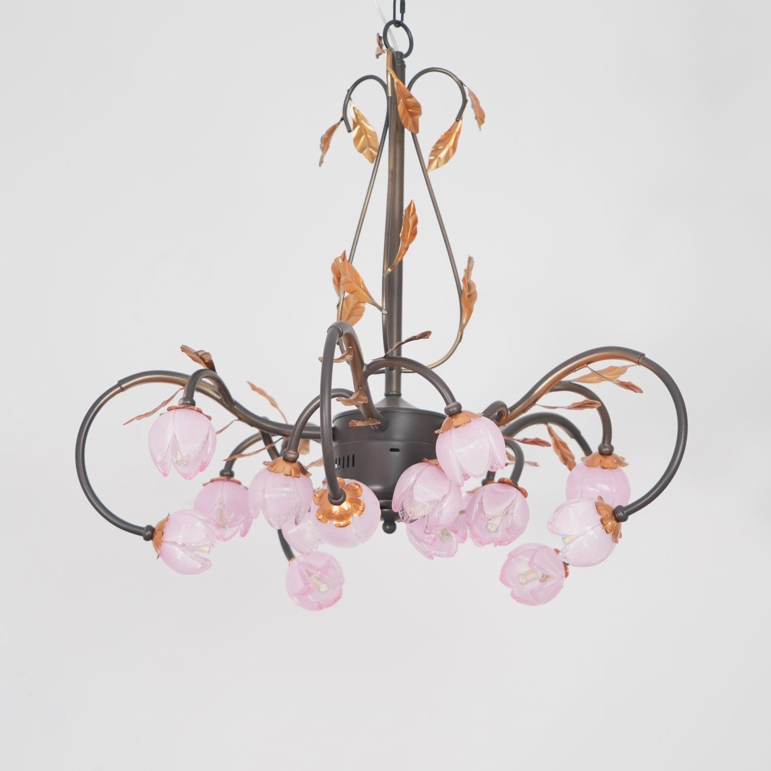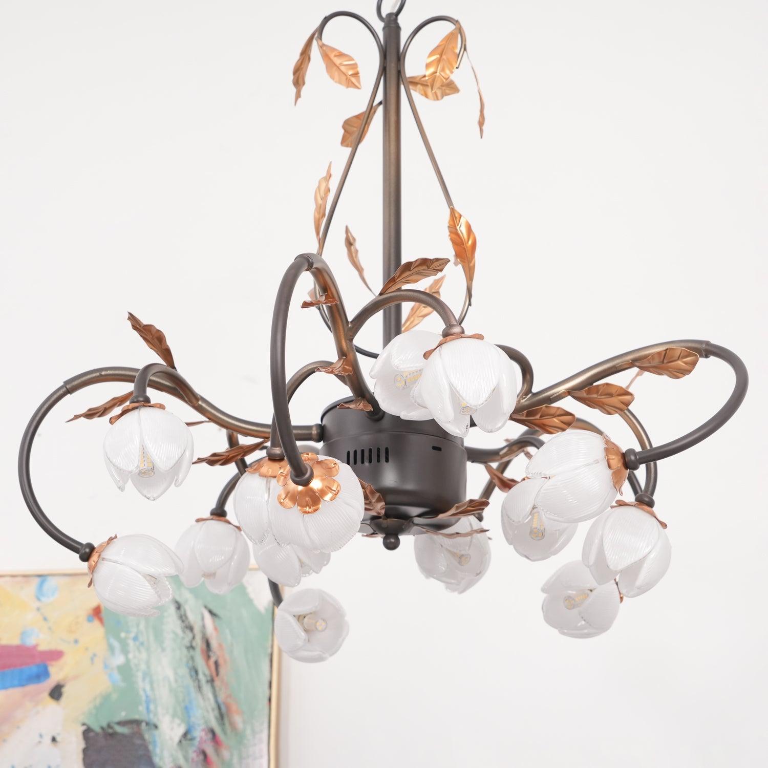 This Eden's Blossom Chandelier offers an elegant and modern look to any room. Its petals and glass construction will give your space a charming, country-style ambiance. Its distinct tulip-shaped lampshade will add a touch of sophistication. Its design is inspired by the lushness of a secret garden with intertwined branches that curve elegantly to cradle blossoms of light. The metalwork, finished in a rustic hue, evokes the wild beauty of nature, while the glass flowers diffuse a soft, enchanting glow, creating an alluring ambiance in any space it adorns. This chandelier is a testament to the timeless appeal of nature-inspired designs, bringing a piece of the outdoor serenity into the modern home.