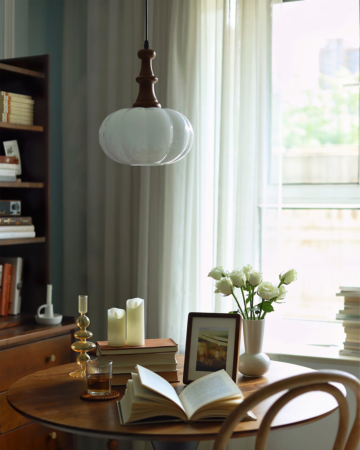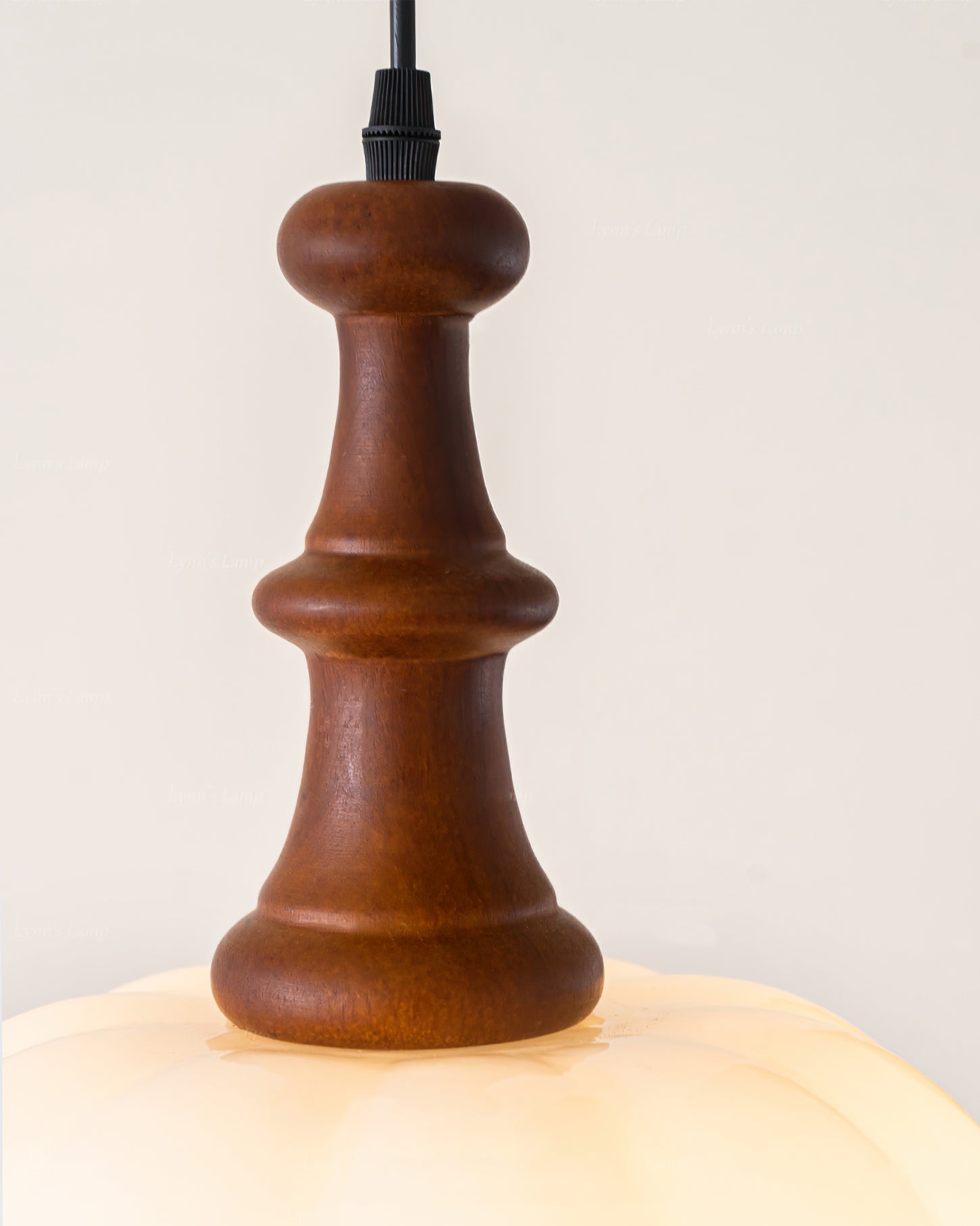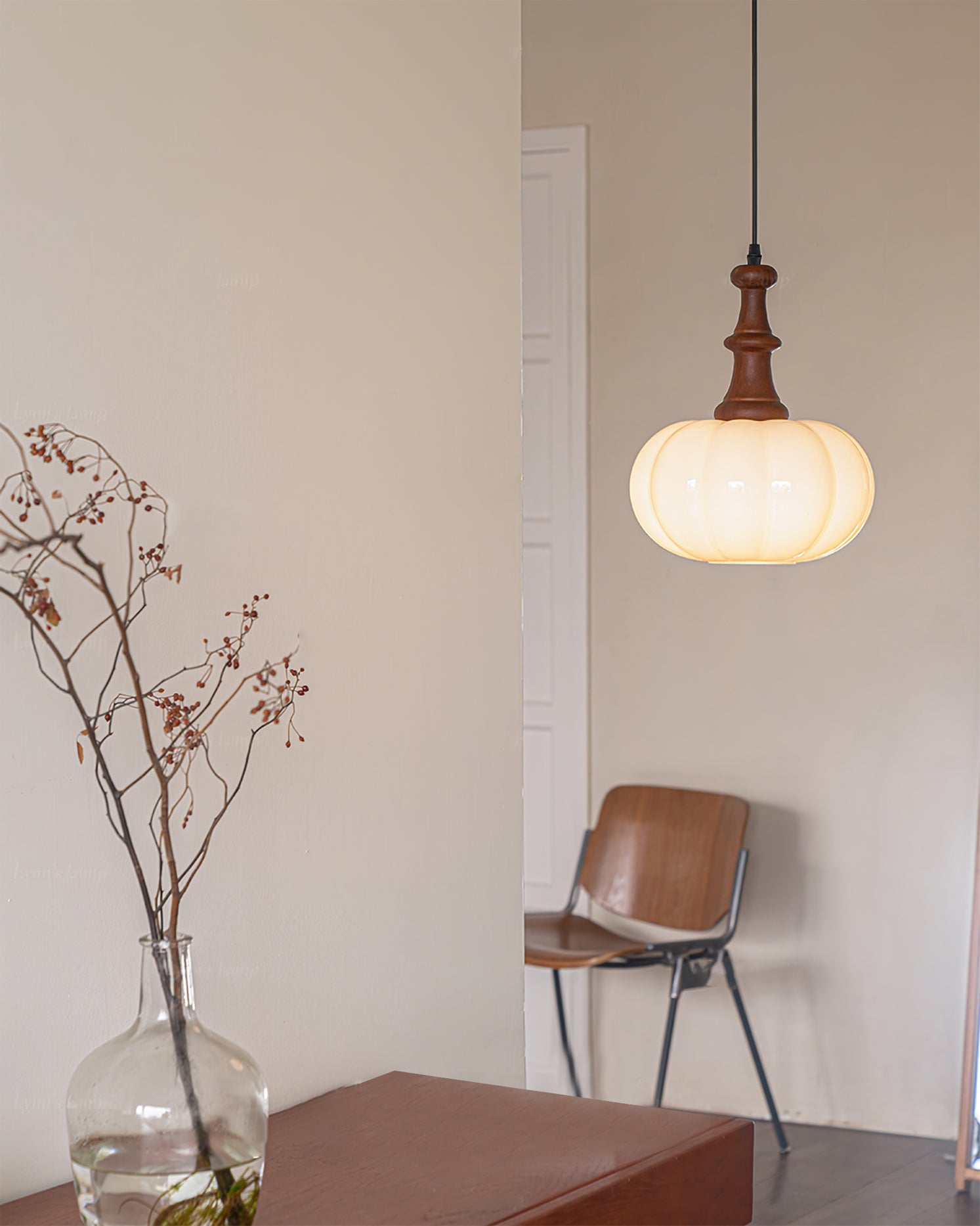 The Eloise Pendant Lamp, available at dekorfine, is a perfect blend of modern and rustic charm. Featuring a beautifully sculpted wooden stem that adds warmth and character, it seamlessly transitions into a stunning glass shade designed to resemble a classic, elegant pumpkin. The glass shade emits a soft, inviting glow, making it an ideal choice for dining areas, living rooms, or cozy nooks. This lamp not only provides functional lighting but also serves as a statement piece that enhances any decor with its unique and artistic design.