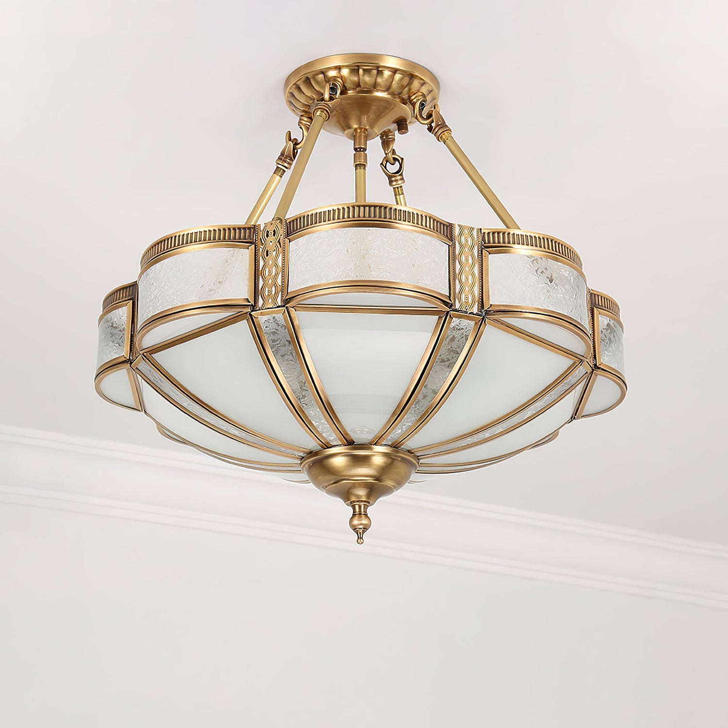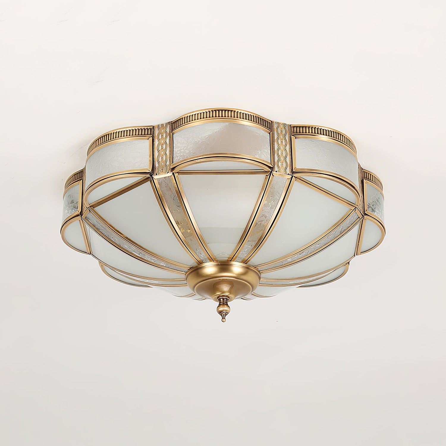 Illuminate your home with a touch of elegance with our Floral Brass Ceiling Lamp. The vintage-inspired design features beautiful floral detailing and is crafted from high-quality brass and milk glass. With its warm and soft lighting, it's the perfect addition to any bedroom or living space.