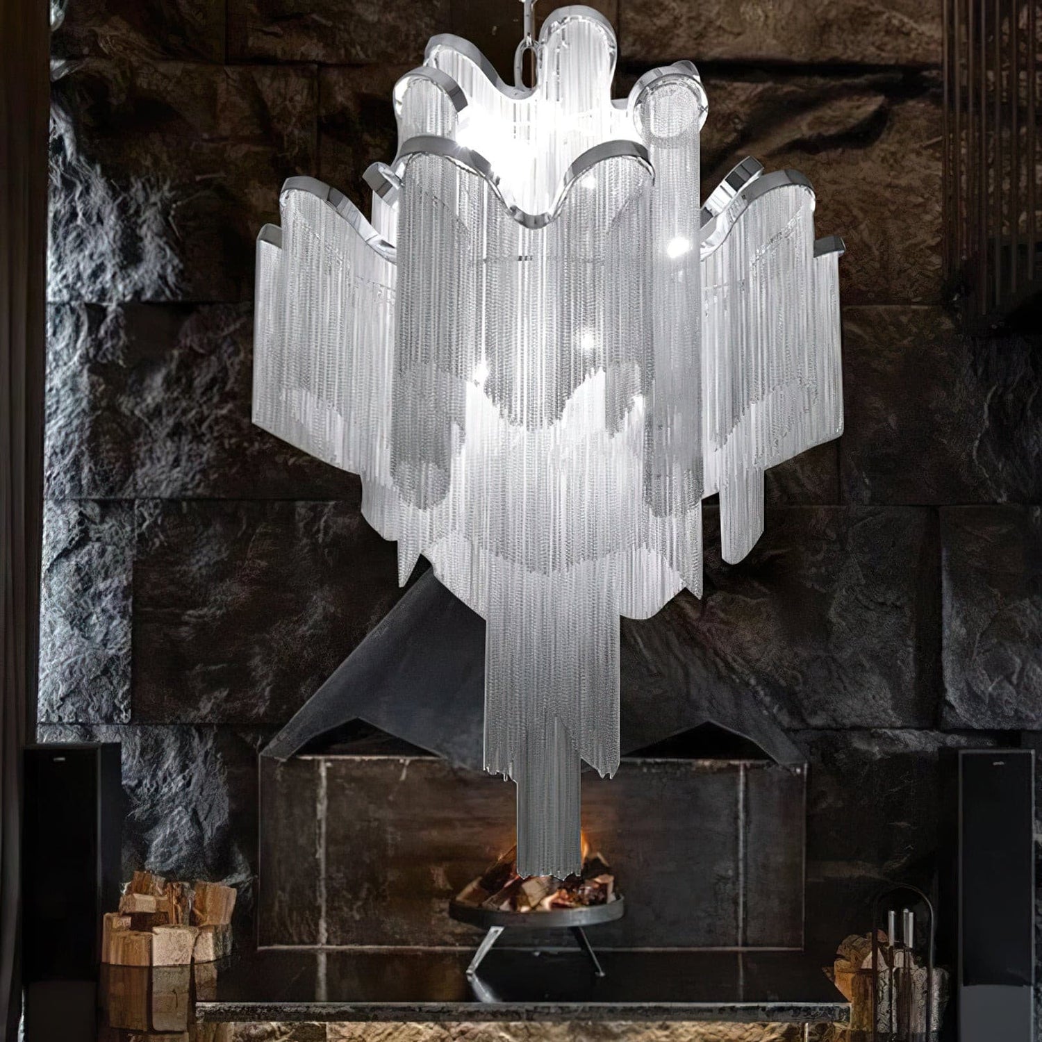 This exquisite pendant fixture is in a chrome finish. The frame is made out of iron. Iron strings are dropped from the top of the fixture and the length of strings can be adjustable. You can create a timeless feel in any room while using modern forms. Its flowing and draped chain and smoke hand-cut and polished crystals embedded within a steel frame will illuminate romantic shadows onto your walls.