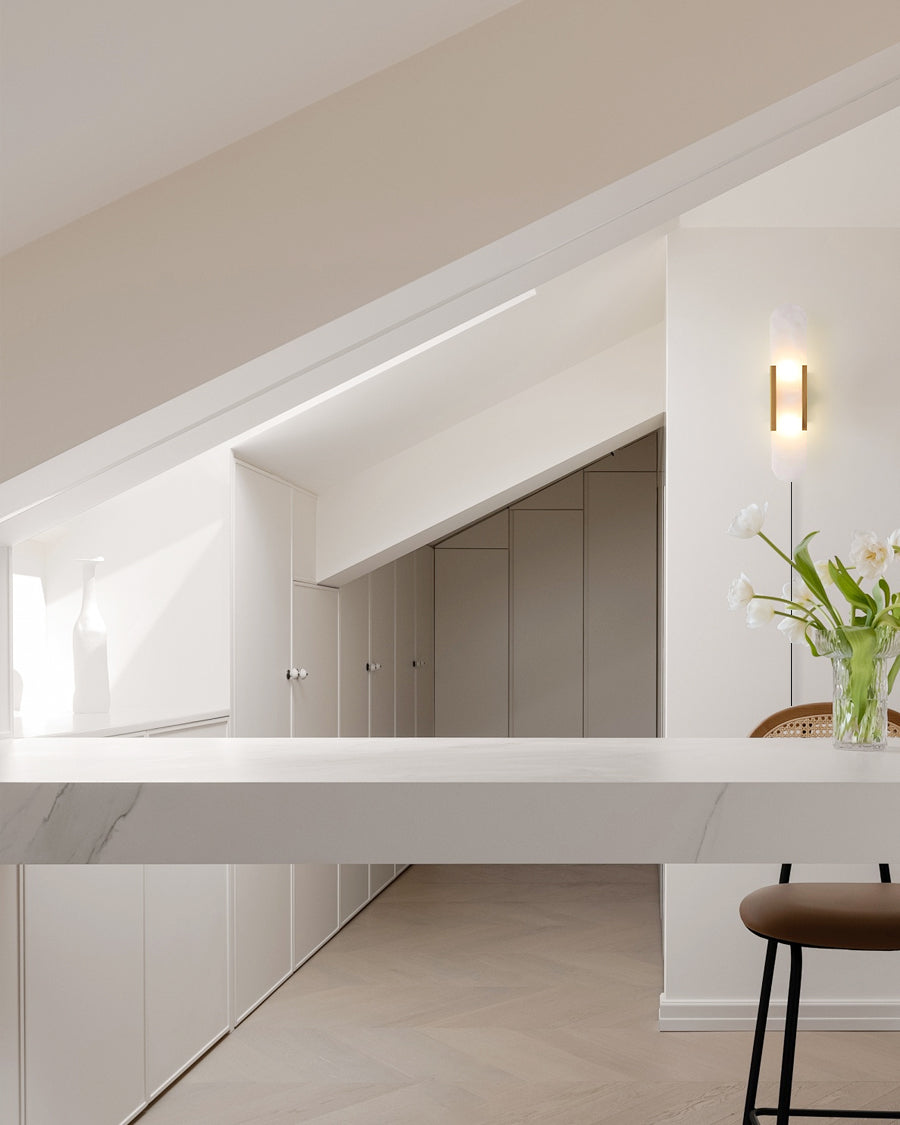 Effortlessly pairing natural alabaster and sleek metal detailing in a streamlined geometric form, the Geometric Harmony Alabaster Wall Lamp exudes a modern refinement while emphasizing the beauty of natural stone. This sconce features hand-carved natural alabaster with either Brass detailing.