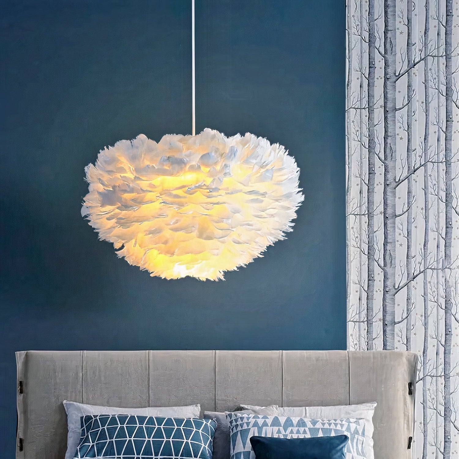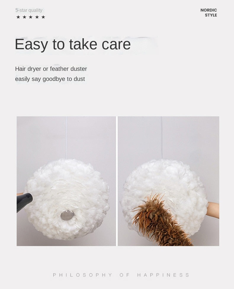 A nice, low-cost, and functional ceiling light fixture to meet your basic lighting needs. This feather lampshade pendant hanging lamp features a metal base. Perfect for the office, kids' room, clothing store, or college dorm!