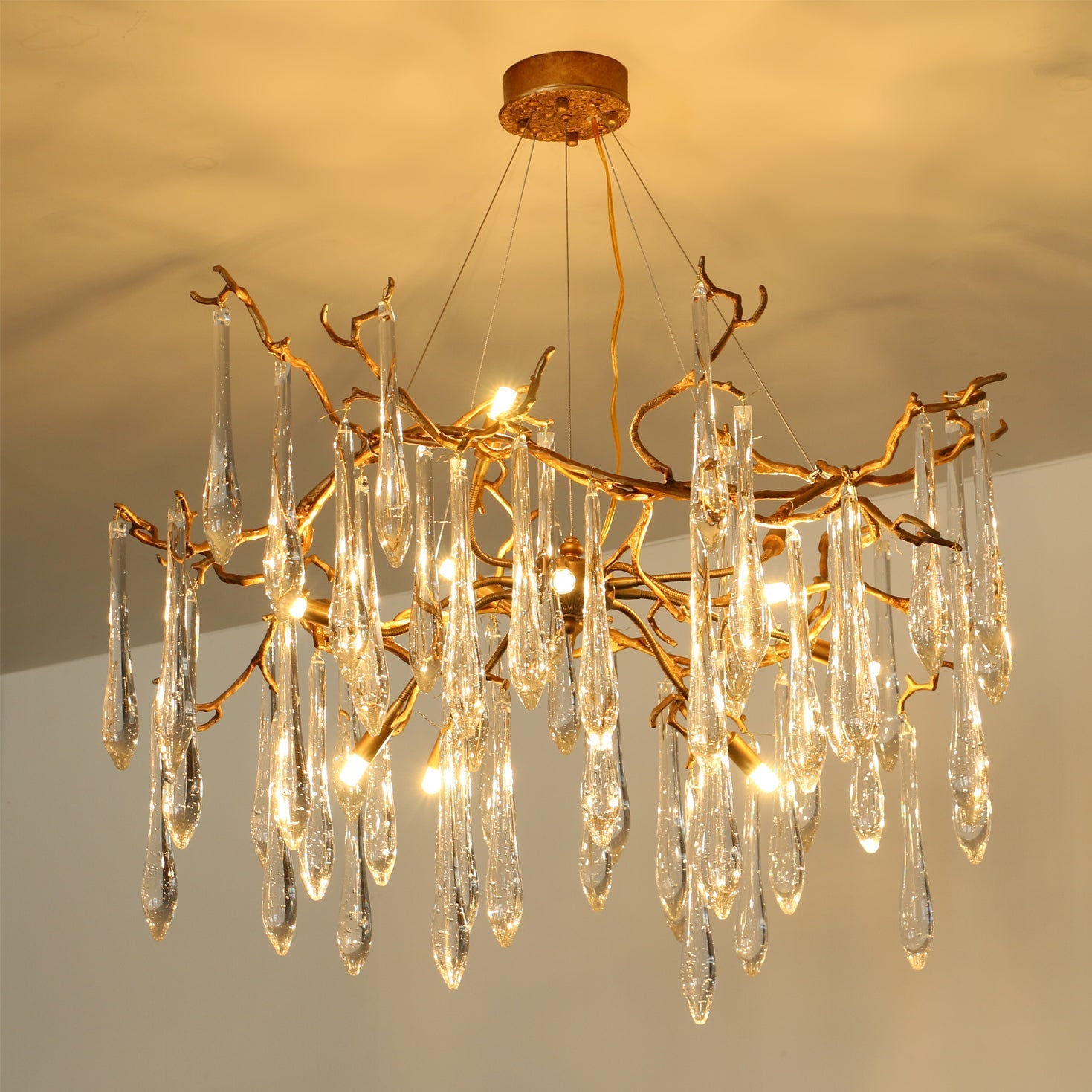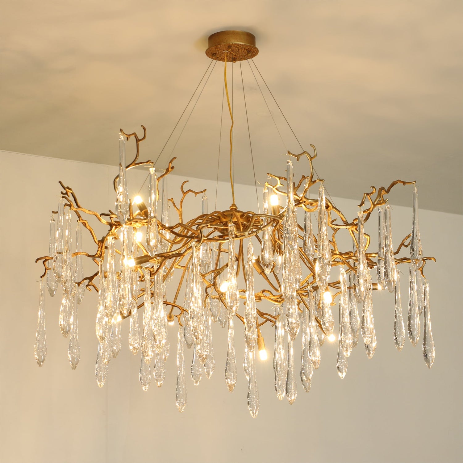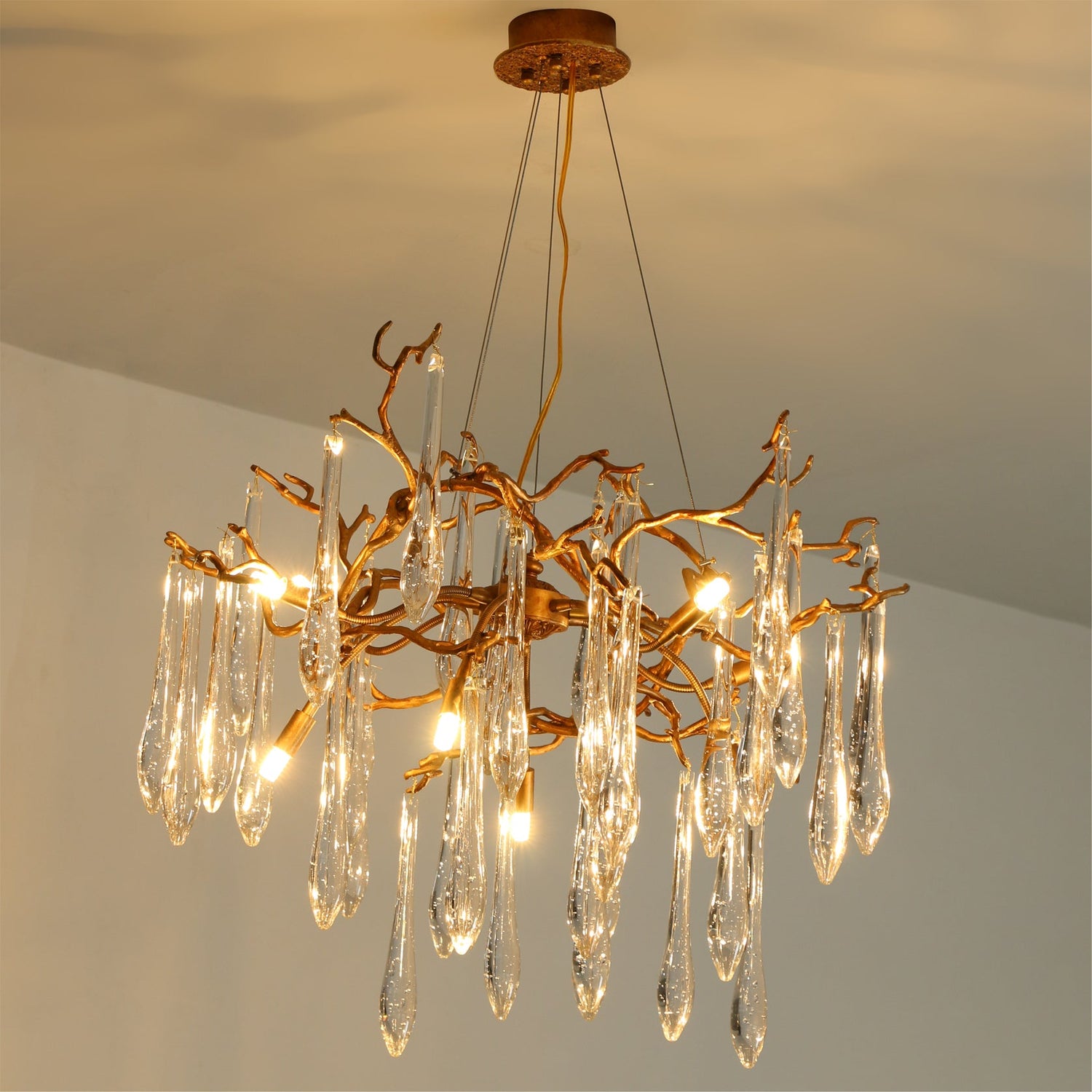 The Livio Chandelier from dekorfine is an exquisite masterpiece combining brass and crystal in a stunning antique bronze finish. Its intricate design features brass branches adorned with shimmering crystal drops, creating a breathtaking display reminiscent of glistening icicles. Perfect for adding a touch of elegance to any space, this chandelier illuminates with a warm, inviting glow, making it an ideal centerpiece for dining rooms, living areas, or grand entryways