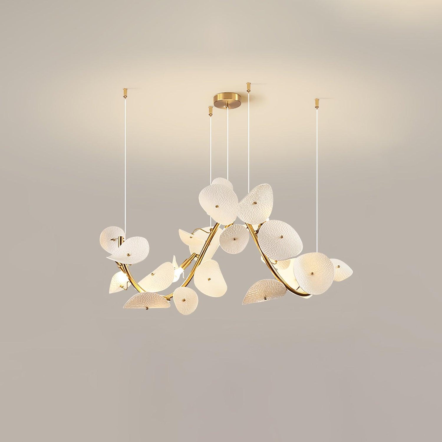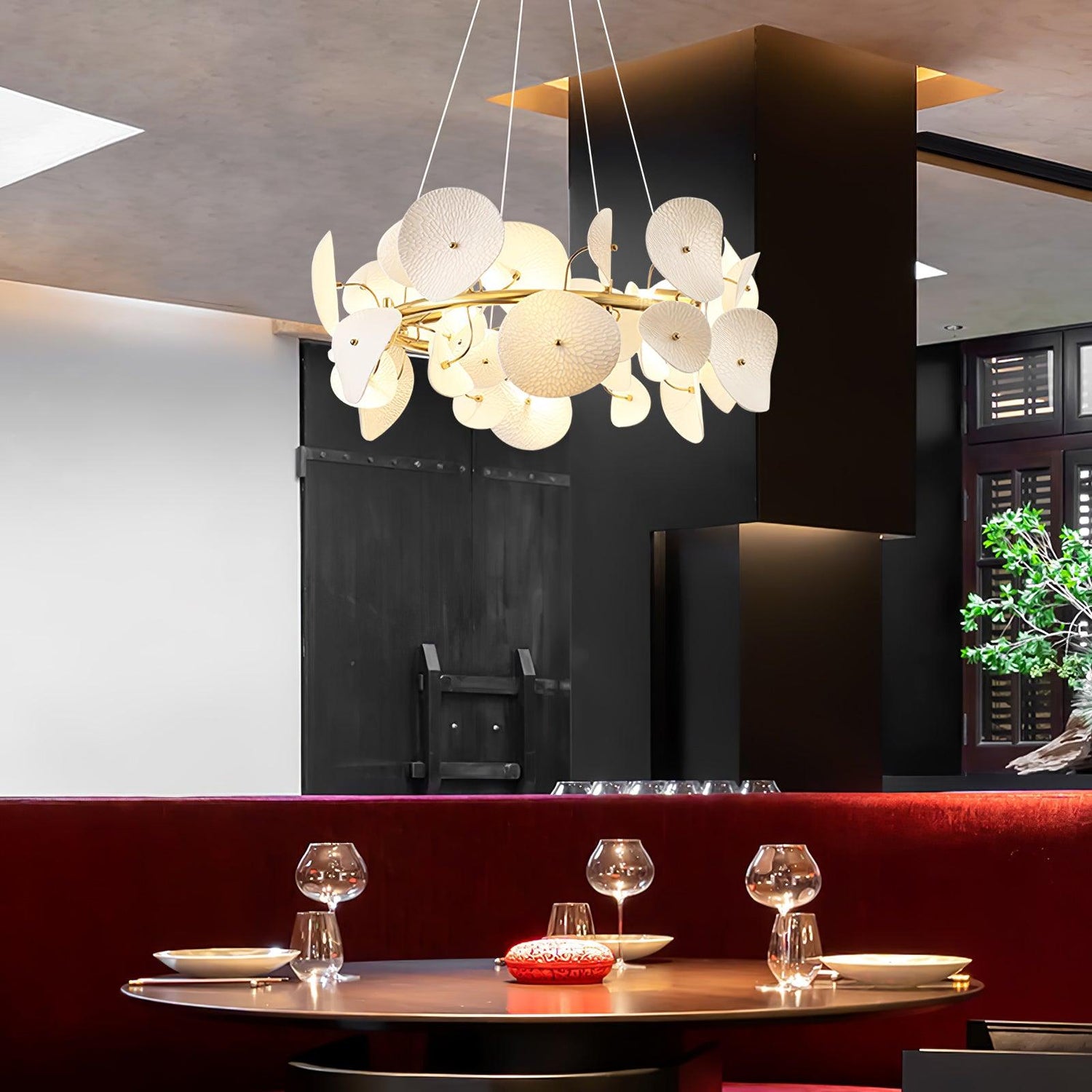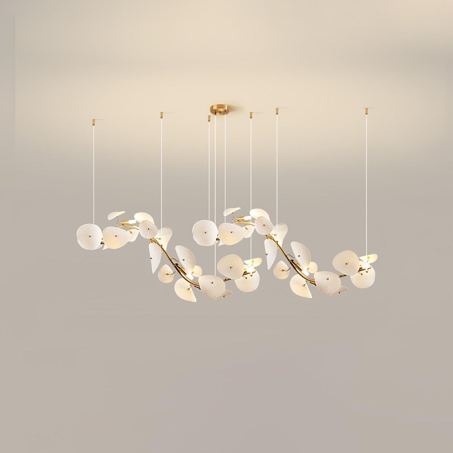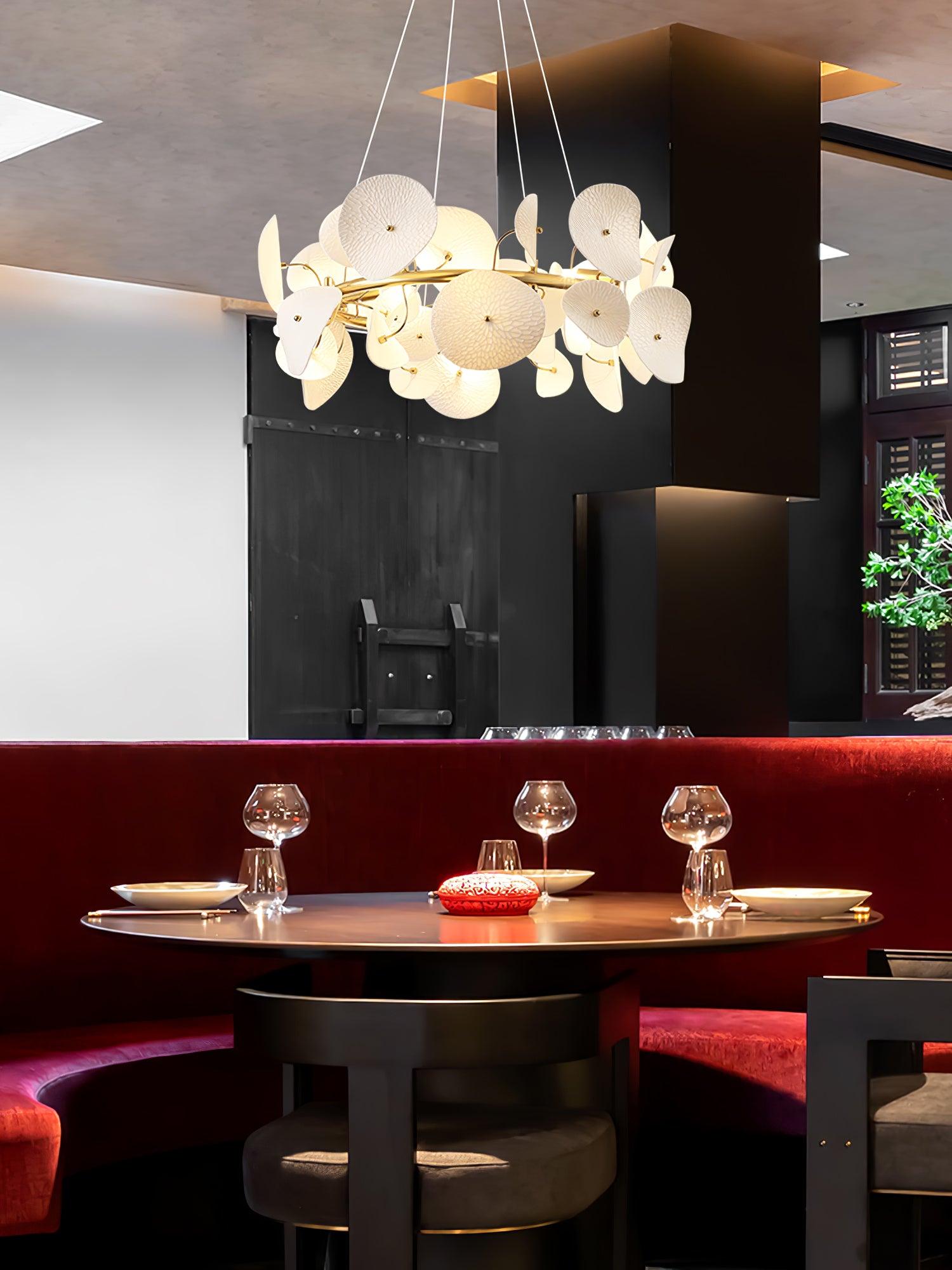 The Lotus Petal Chandelier is a sophisticated fusion of art and illumination. Fashioned from fine ceramic, each petal boasts a lifelike delicacy, culminating in a breathtaking array of light. The metallic touches lend a contemporary flair to the fixture, providing a lustrous contrast to the matte finish of the ceramic. This chandelier, a symbol of purity and renewal, evokes the serene beauty of a lotus pond at dawn. With its soft ambient lighting, it creates a focal point that is both calming and captivating. Perfect for gracing the center of a living room or hovering above a grand dining table, the Serenity Petal Chandelier promises to infuse your space with a timeless elegance and a touch of nature's bliss.