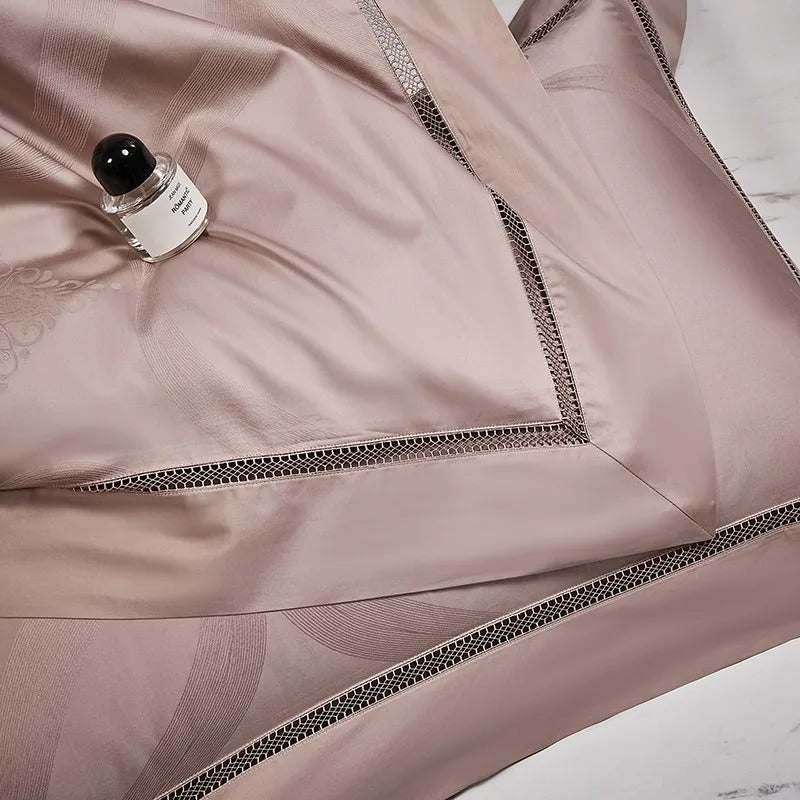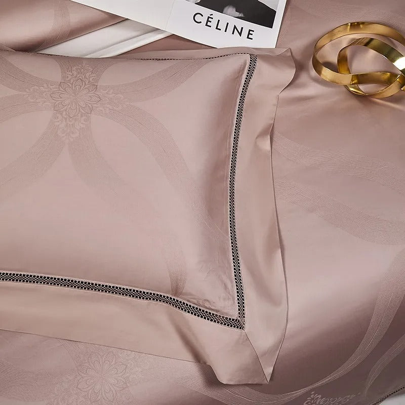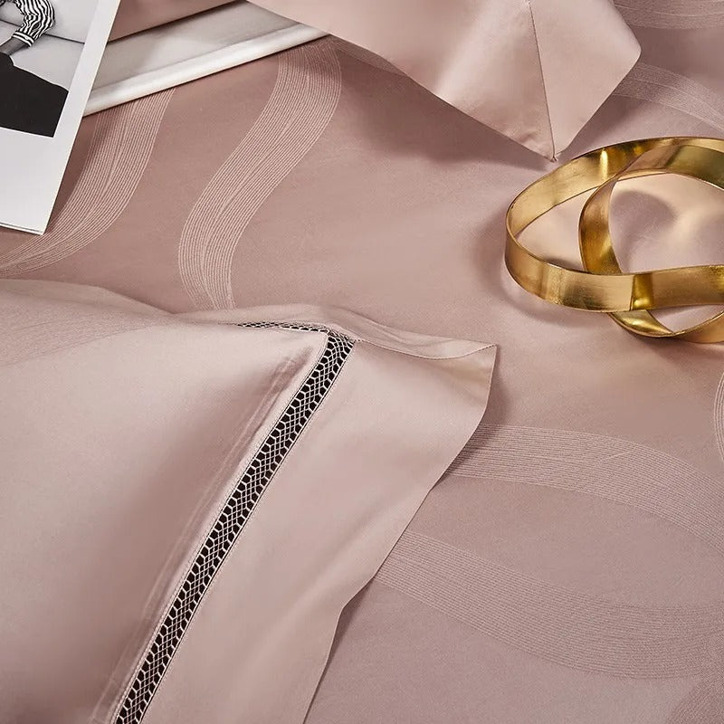 Mirage is a sumptuous bedding set finely crafted from 1000TC Egyptian cotton. It features a warm, sandy beige tone, evoking the serene hues of a tranquil desert. The bedding is adorned with a subtle, embossed geometric pattern that offers depth and texture, while the scalloped edges and intricate embroidery add a touch of sophistication. This set brings an understated elegance and a whisper of exotic charm to your bedroom, ensuring a luxurious and peaceful slumber.