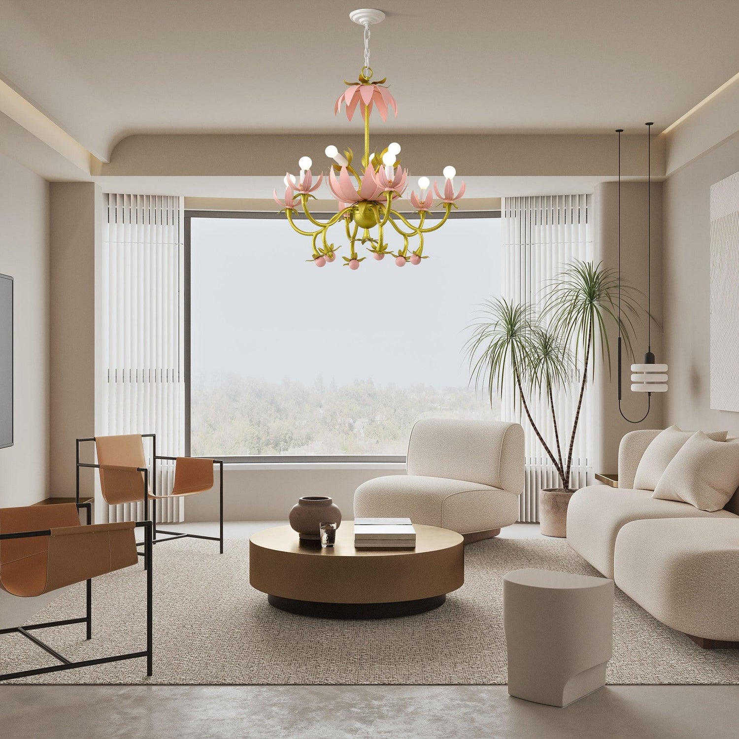 This charming Mardi Gras Blossom Chandelier is a wonderful piece of art. Inspired by the carnival float images from the early 19th century, this captivating interpretation is entirely handmade with a metal framework and layered with hand-prepared papier-mâché to ensure durability. This eye-catching two-tiered chandelier has nine blooming light sources that will provide a glimmering radiance in any room. The rubber eraser-pink hue is complemented by a forest moss stem.