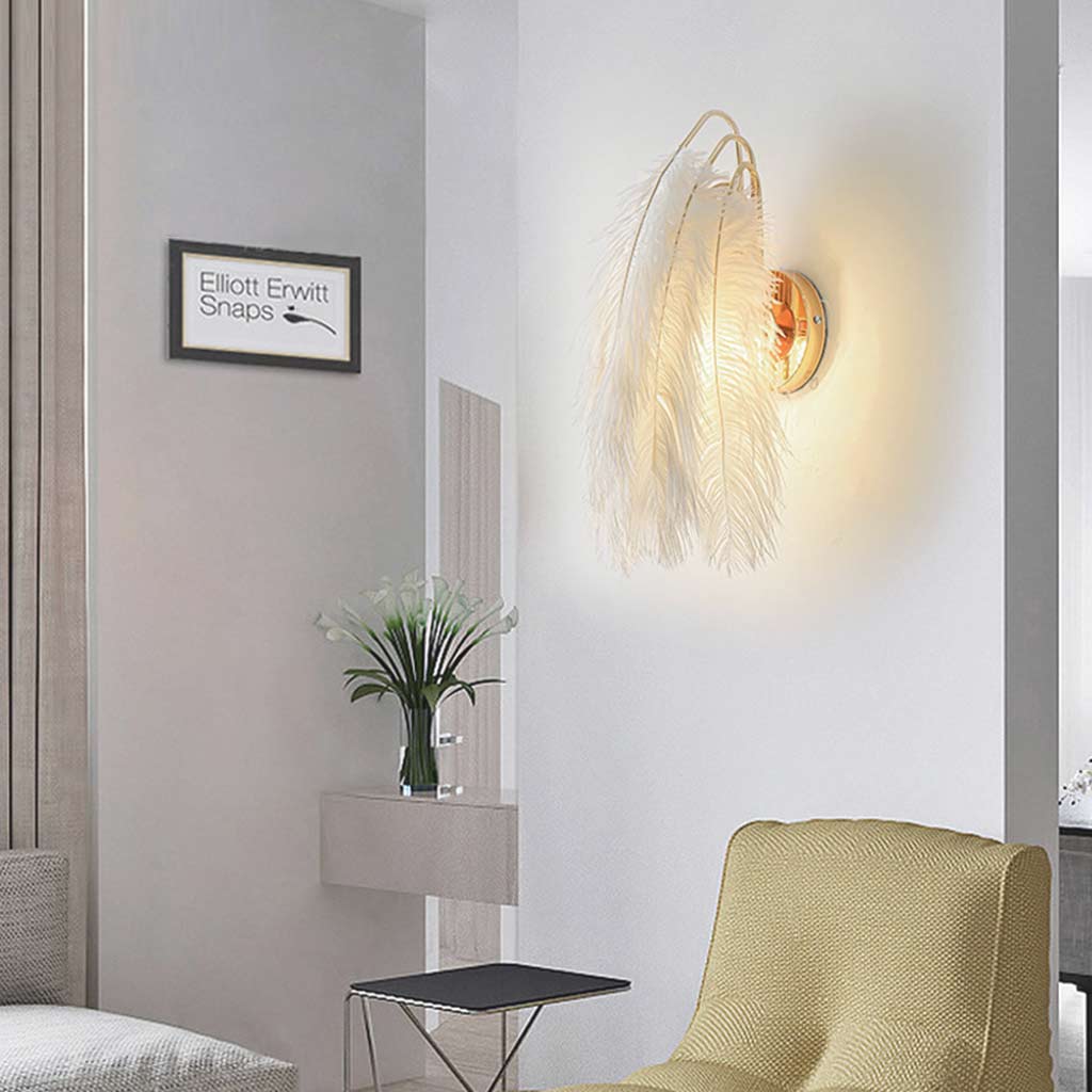 The harmonious fusion of softness and strength is embodied in the lamp's structure, where an iron arm supports the delicate feathers with grace. The meticulous design ensures a secure wall mounting that complements the fluid lines of Nordic aesthetics. Whether gracing your living room, bedroom, or study, this lamp effortlessly enhances a variety of decor styles, inviting serenity and sophistication into your everyday life.