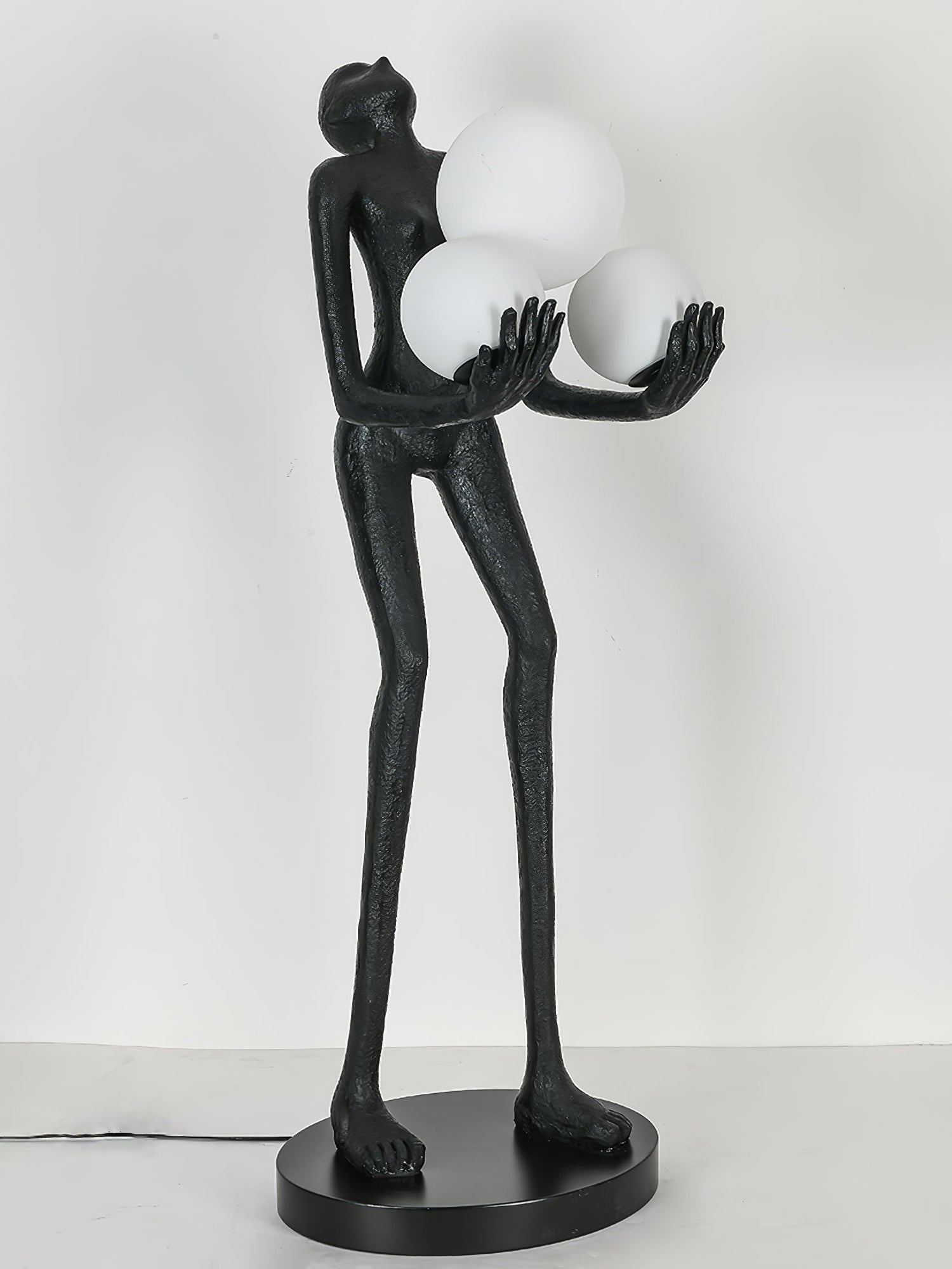 The Moonlit Guardian Floor Lamp is inspired by the protective and nurturing spirit of a celestial guardian. The figure is elegantly designed to cradle glowing orbs, evoking a sense of warmth and security. The textured black finish gives it a timeless, artistic appeal, making it a perfect addition to bedrooms, living rooms, or cozy reading nooks. The Moonlit Guardian Floor Lamp combines functionality with sculptural artistry, offering a soft, ambient light that enhances the atmosphere of any room.