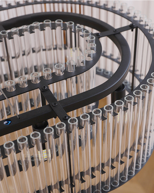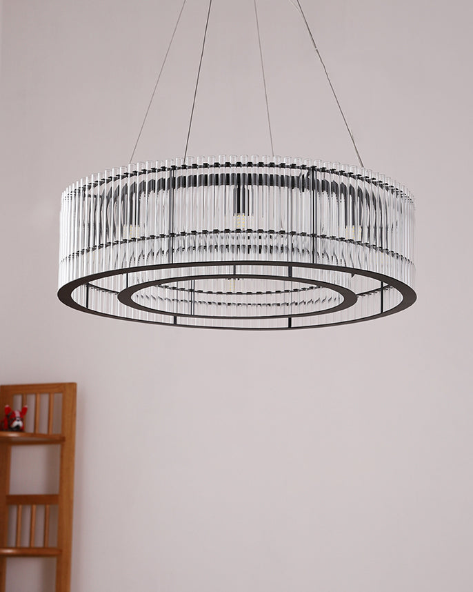 Illuminate your space with the Mossi Glass Chandelier from dekorfine, a stunning fusion of modern elegance and classic design. Crafted from premium metal and glass, this chandelier features a sleek, circular frame adorned with vertical glass rods that beautifully refract light, creating a mesmerizing display of brilliance. The understated black finish adds a touch of sophistication, making it a perfect centerpiece for any contemporary or luxurious setting. Elevate your décor with this exquisite piece that effortlessly combines form and function.