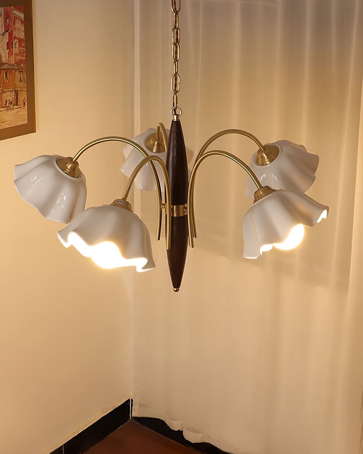 Elevate your home decor with the Olina Flower Ceramics Chandelier from Dekorfine. This stunning chandelier features a harmonious blend of ceramic, metal, and wood materials, creating a sophisticated and timeless piece. The flower-shaped ceramic lampshades add a touch of elegance, while the wooden accents and metal framework provide a sturdy and stylish structure.