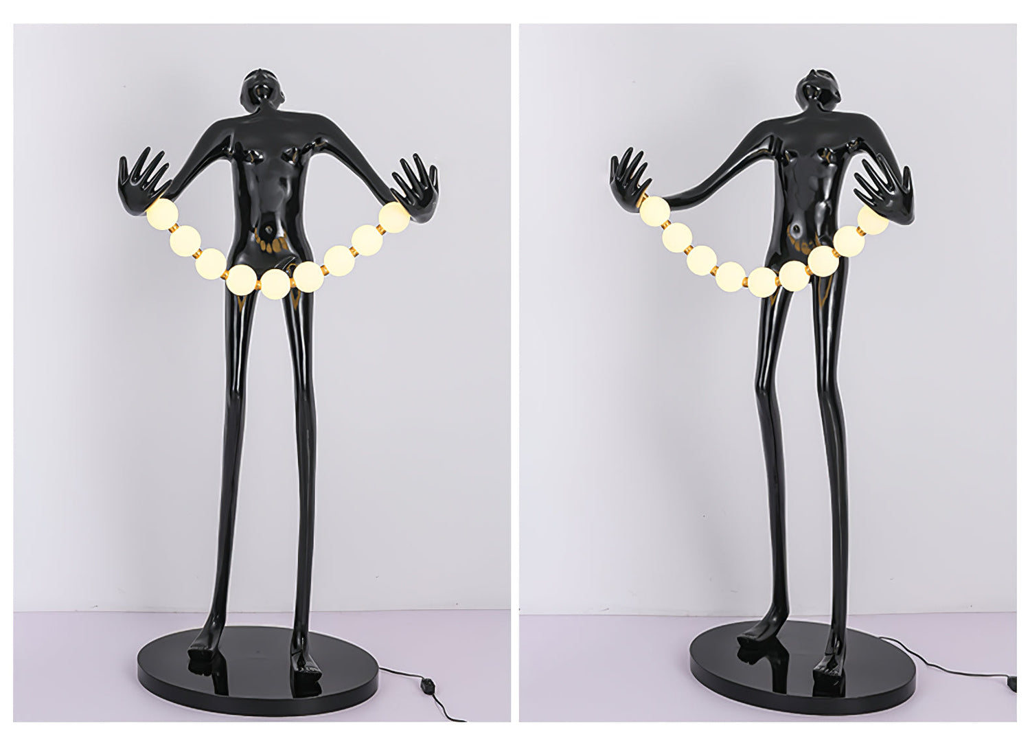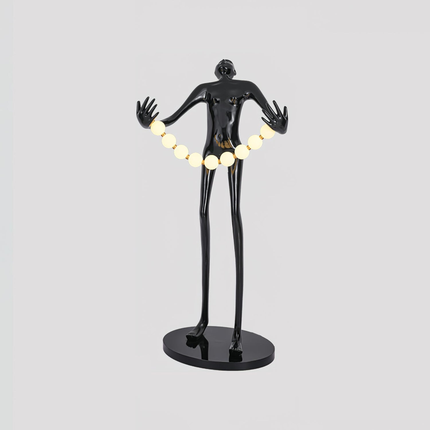 The Orb Juggler Floor Lamp is inspired by the whimsical elegance of a circus performer. This unique lamp features a sleek, elongated figure holding a string of glowing orbs, creating a playful yet sophisticated light display. The glossy black finish adds a modern touch, making it a captivating piece for any contemporary living room, study, or eclectic space. The Orb Juggler Floor Lamp brings a sense of movement and fun to your decor, providing both light and art in one striking design.