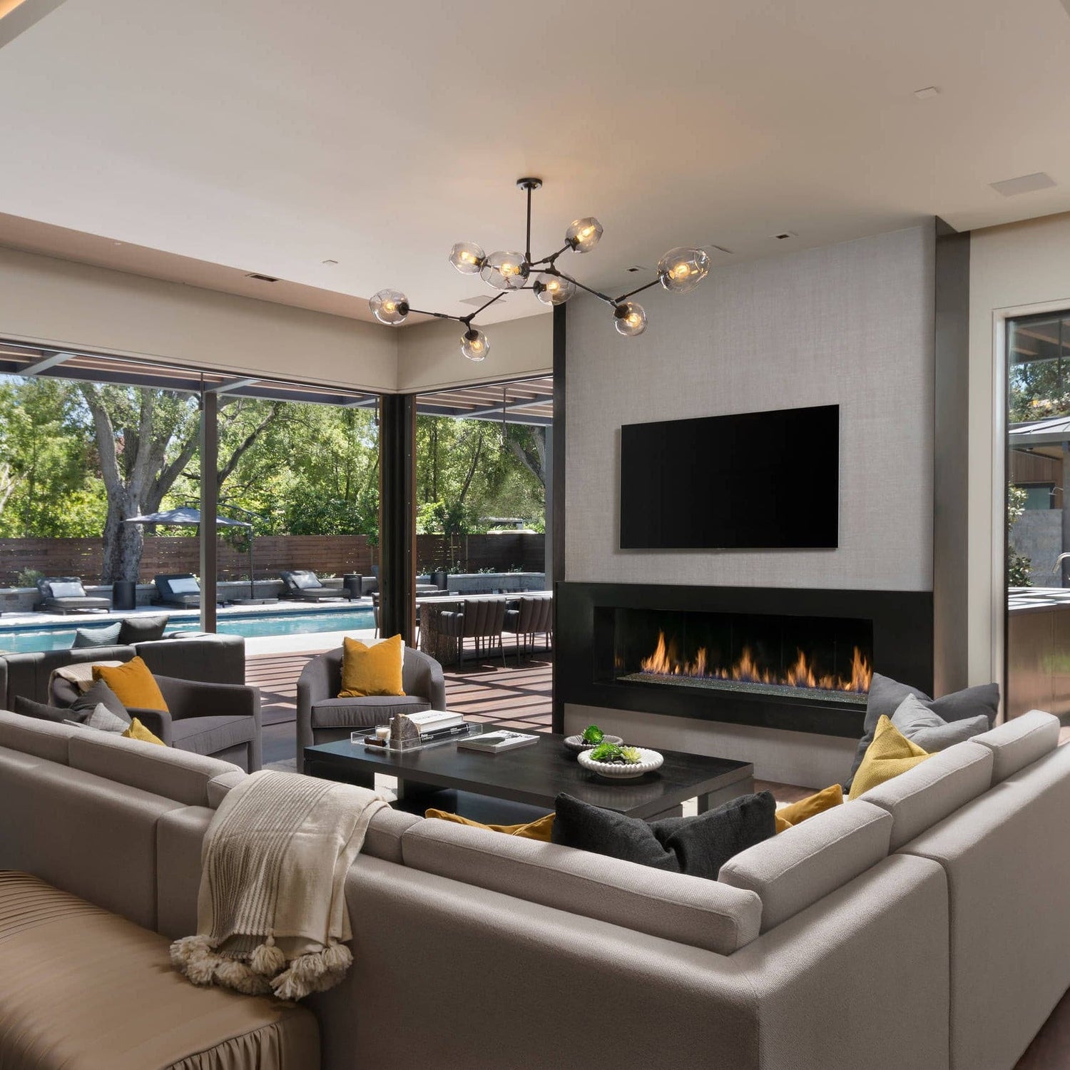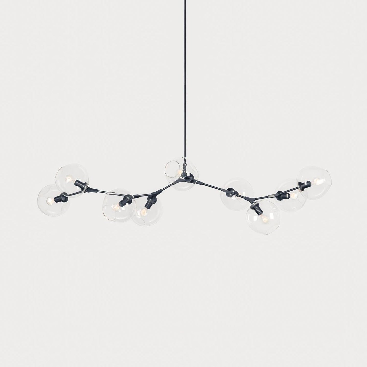 The design showcases an array of clear glass globes, each delicately suspended, creating a stunning visual display that captures the eye. The glass globes are arranged in a horizontal configuration, allowing for an even distribution of light that adds warmth and brilliance to any room.