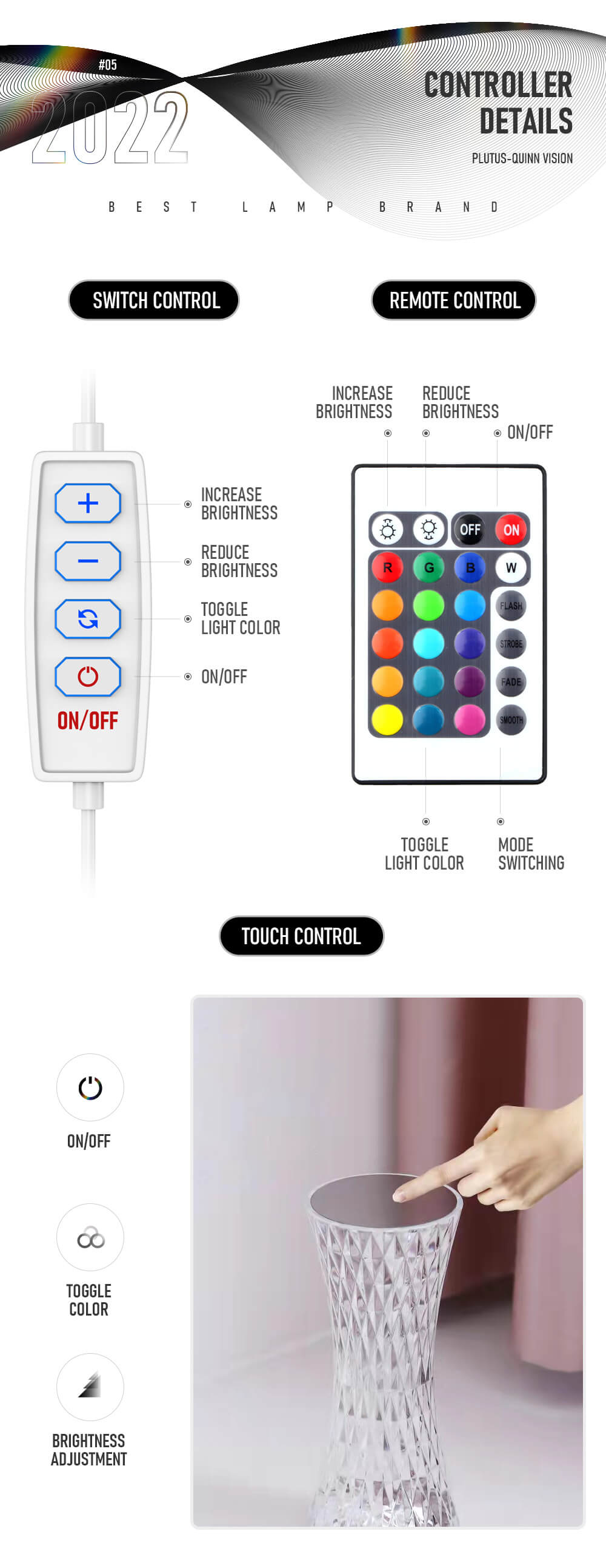 - Touch control for easy brightness adjustment and color change