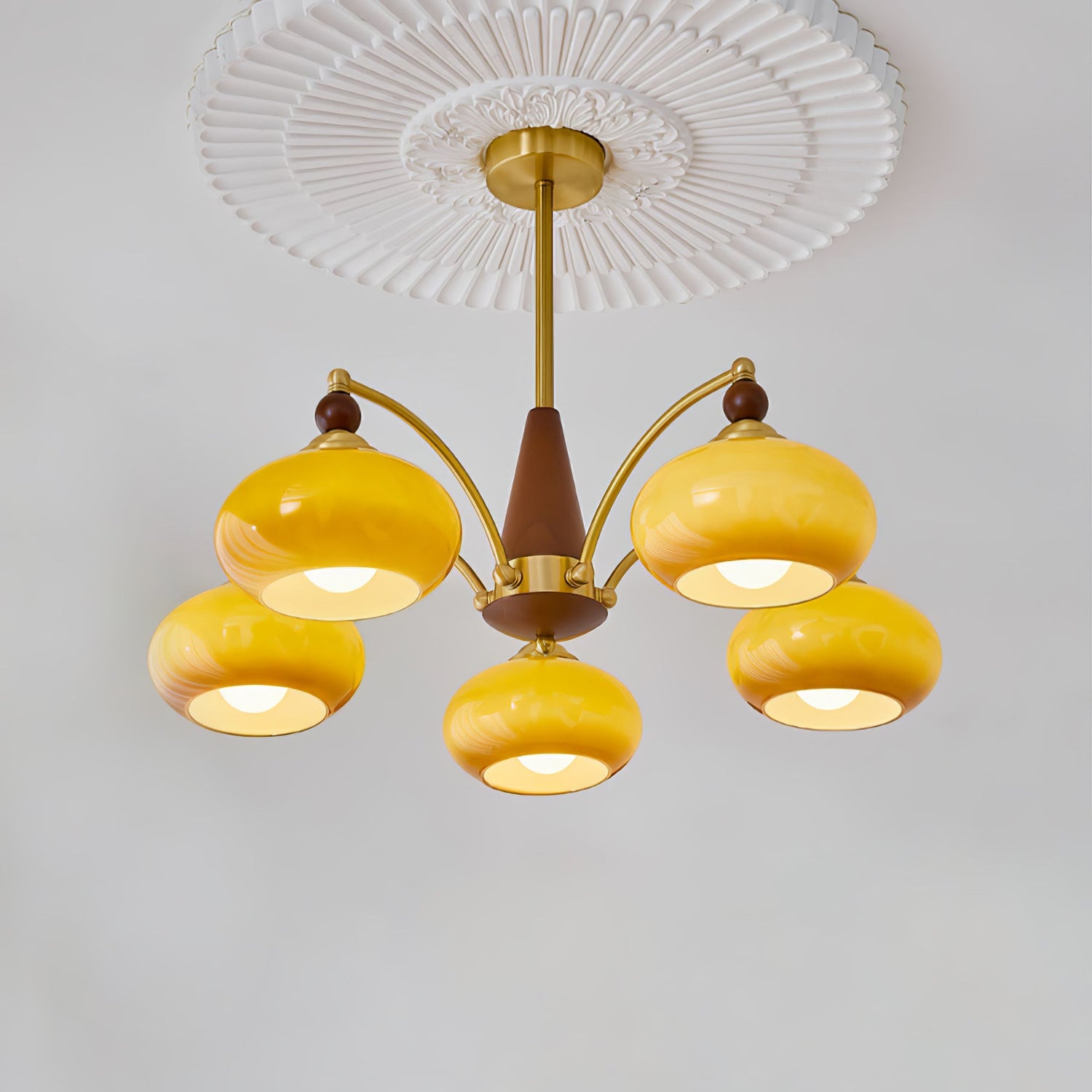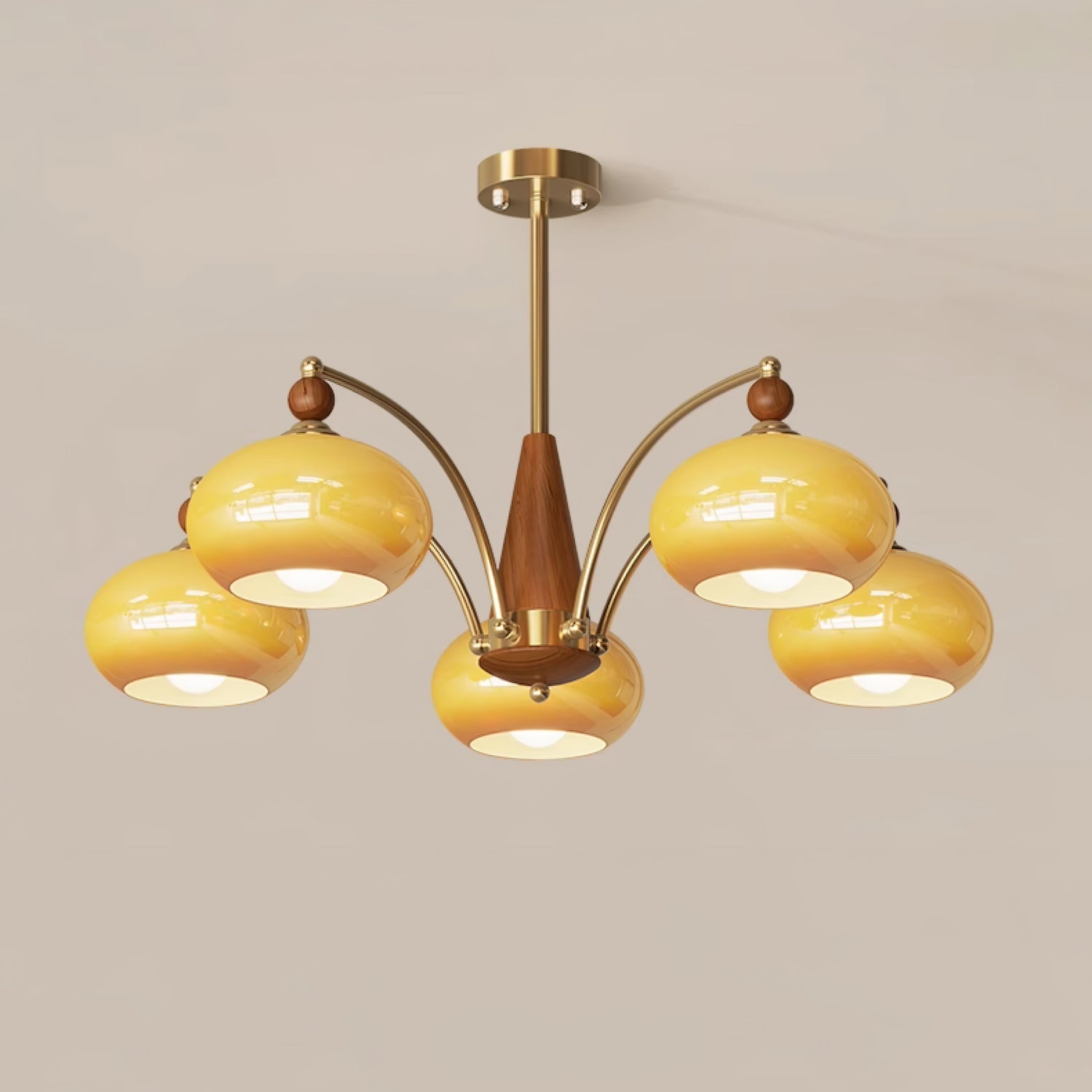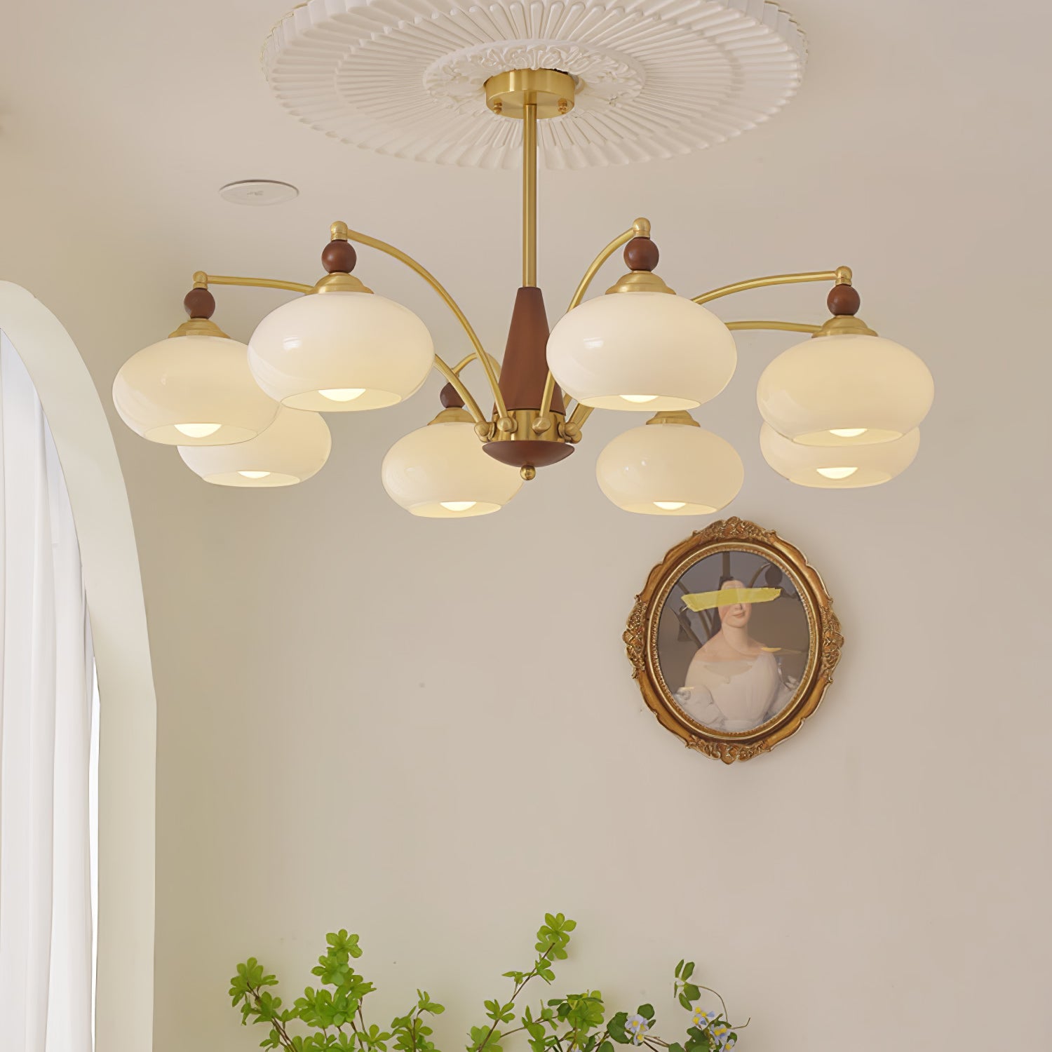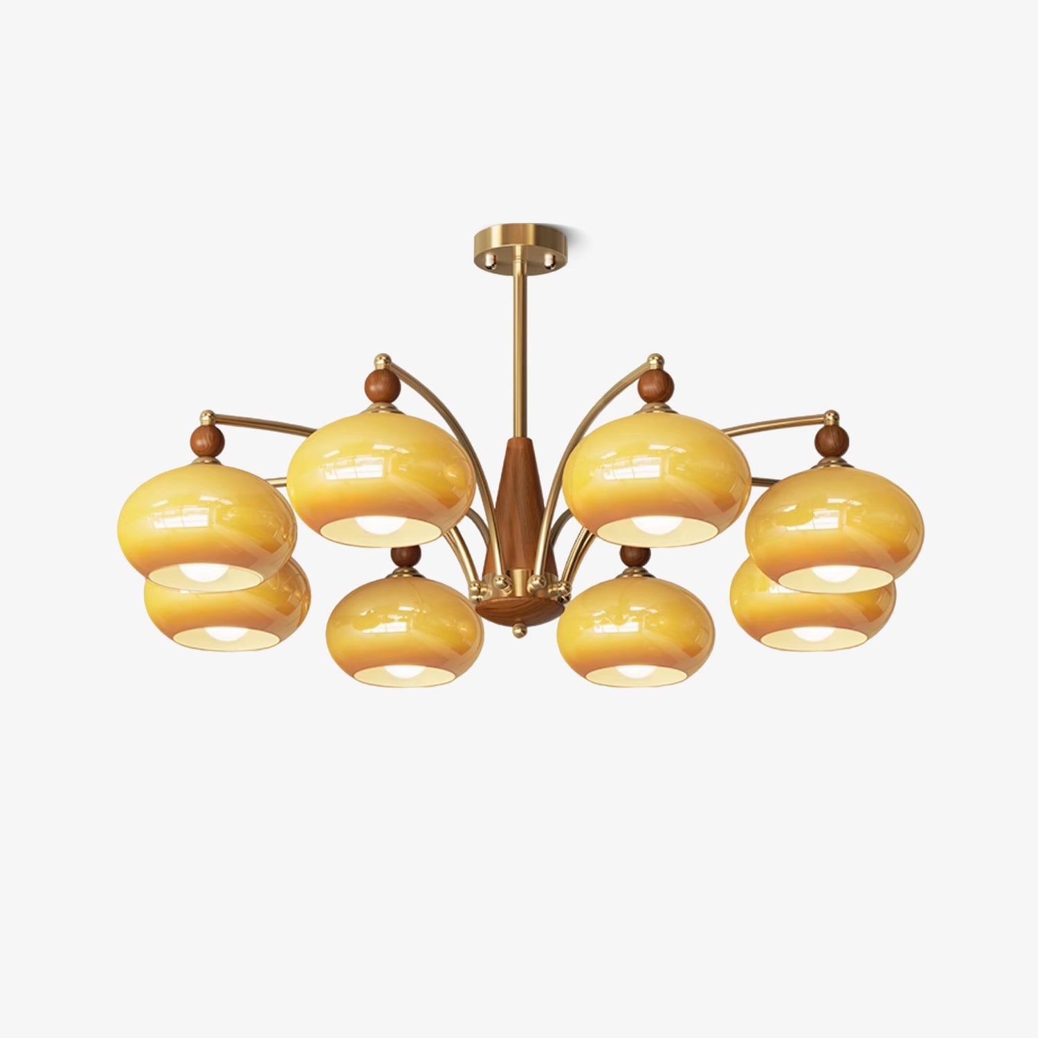 Illuminate your home with the Retro Calliope Elegant Chandelier, a stunning fusion of Victorian elegance and modern Scandinavian simplicity. This exquisite piece transforms any space into a sanctuary of light and sophistication. Each of its gracefully curved arms showcases gleaming golden tones, paired harmoniously with rich walnut wood accents that whisper of warmth and refinement. The soft, inviting glow radiates from beautifully crafted glass shades, enveloping your surroundings in a gentle embrace that beckons relaxation and conviviality.