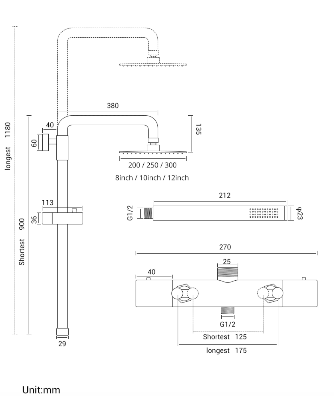 - Dimensions: Height adjustable (up to 80 inches), Rainfall shower head diameter - 10 inches