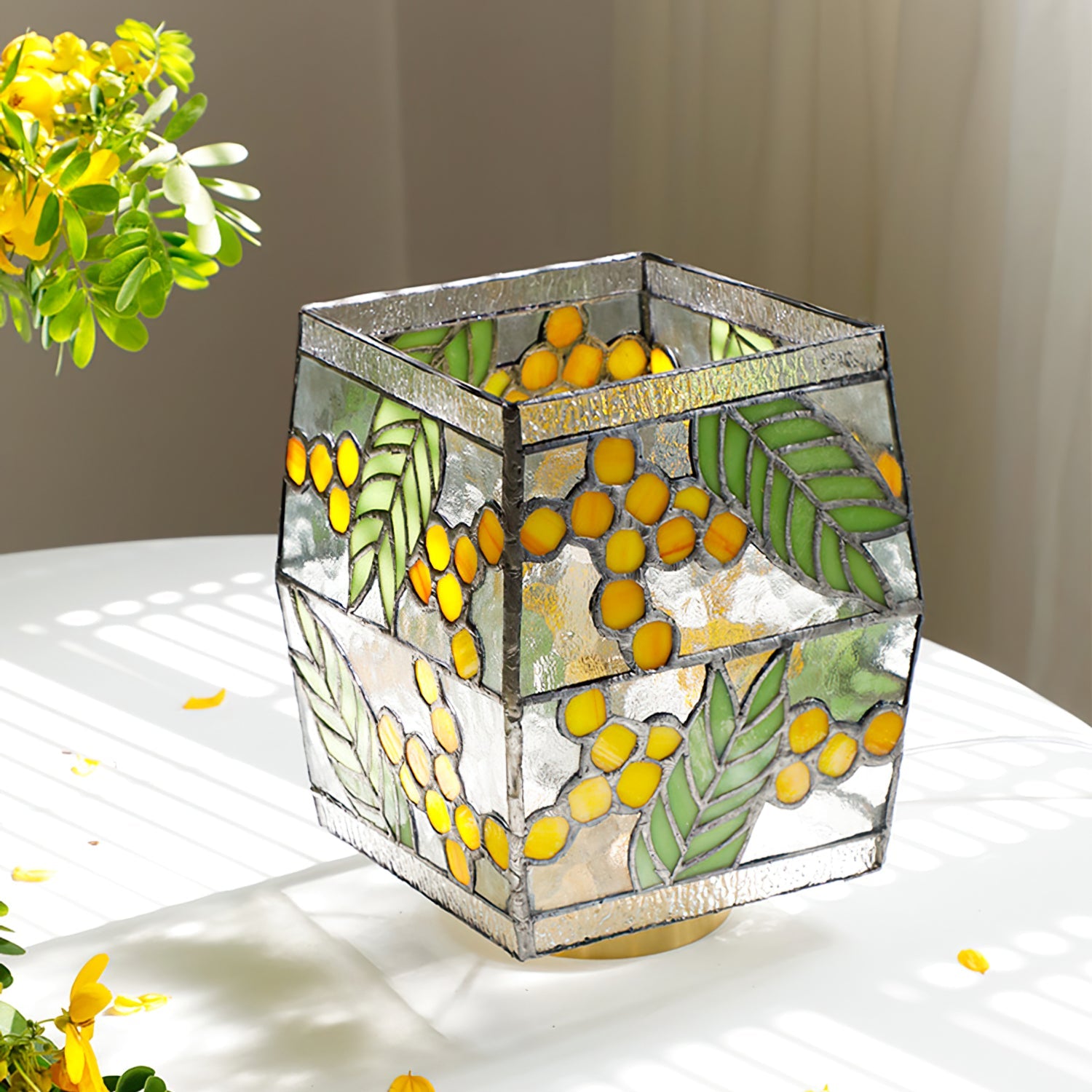 The Seed Table Lamp from dekorfine is a beautifully crafted piece featuring vibrant stained glass adorned with yellow seeds and green leaves. This intricate design creates a warm, inviting ambiance, perfect for any room. The detailed glasswork and rich colors make this lamp a stunning decorative piece, adding a touch of nature-inspired elegance to your home decor. Enhance your living space with the artistic charm of the Seed Table Lamp from dekorfine.