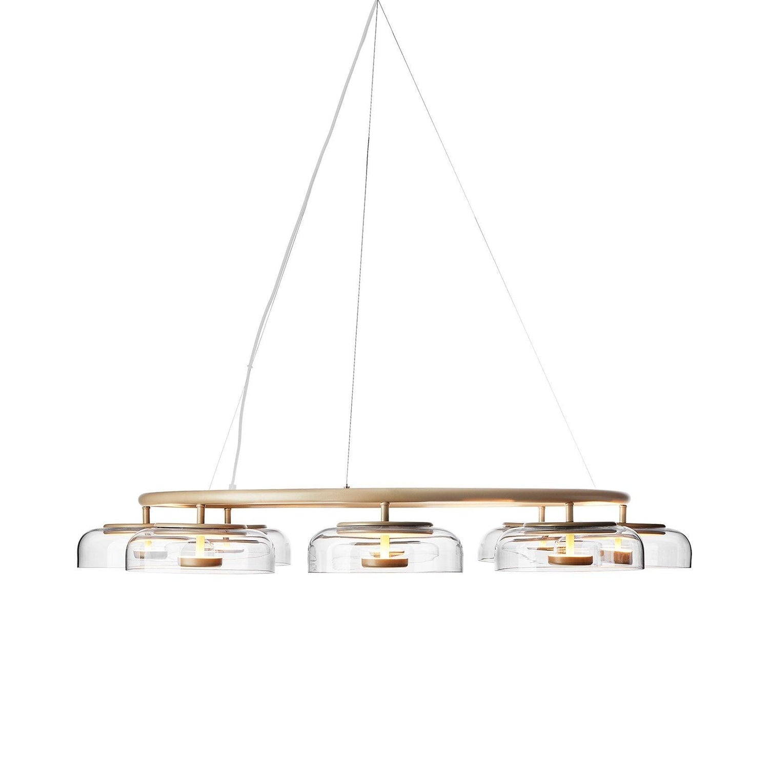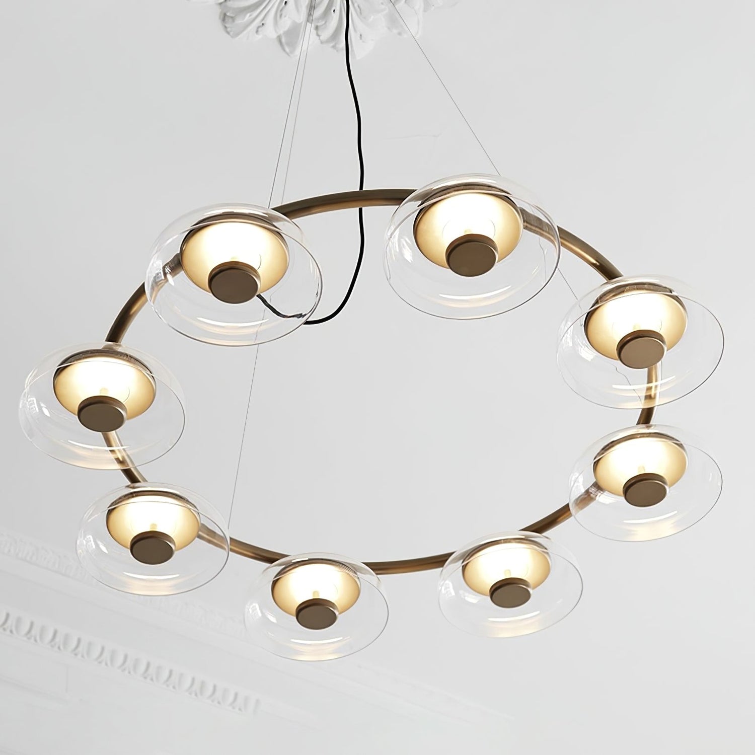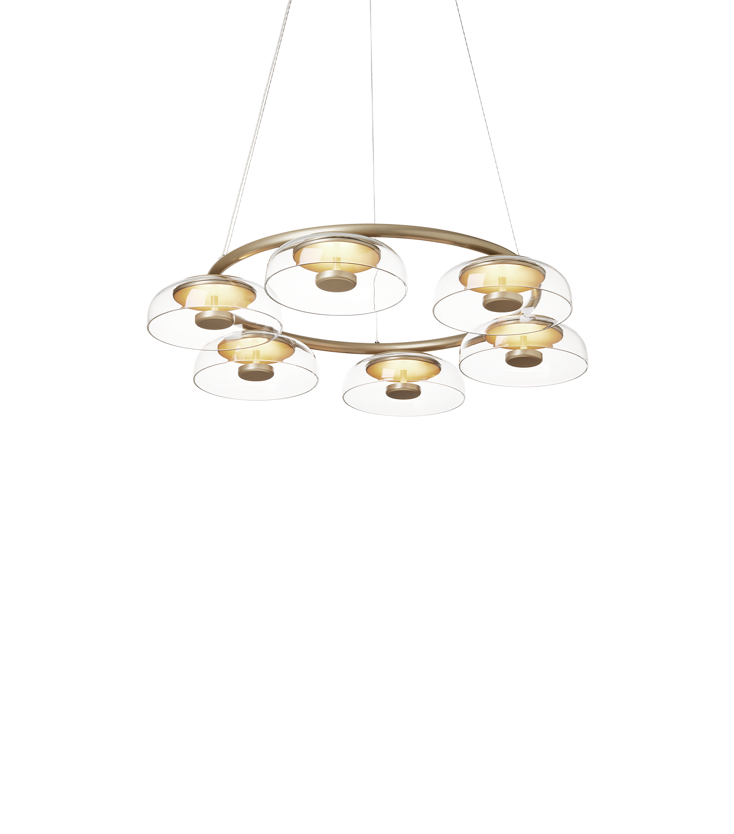 Upgrade your room with the Solara Chandelier, perfect for smaller spaces. Its advanced LED technology placed within a golden metal disc creates a warm, indirect glow through six mouth-blown glass shades. Ideal for standard height rooms like bedrooms, this chandelier effortlessly combines functionality and luxurious style.
