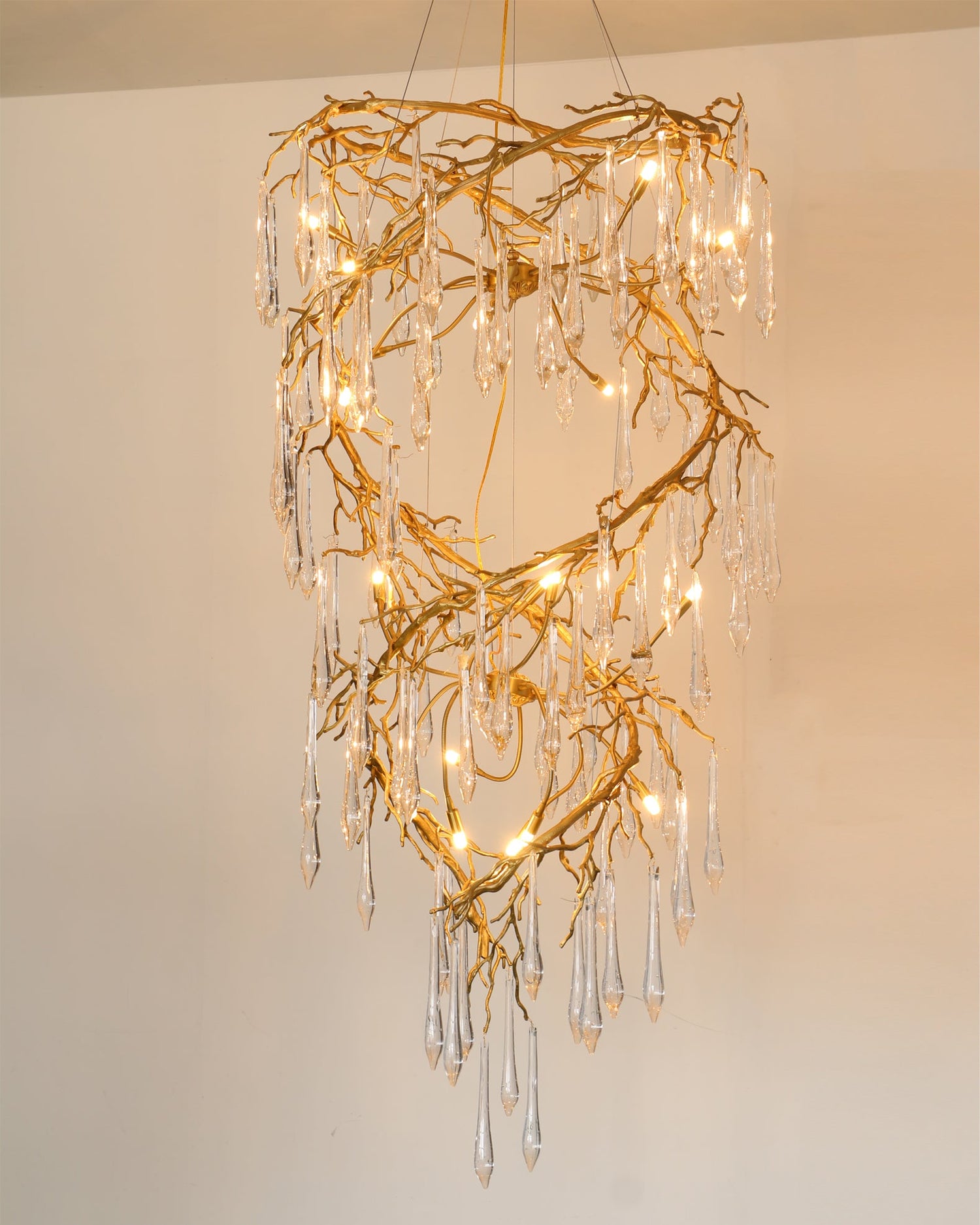 Illuminate your space with the captivating elegance of the Spiral Branches Chandelier. Crafted from high-quality brass, this chandelier features a unique spiral design resembling intertwining branches, adding a touch of nature-inspired artistry to any room. The delicate glass accents hang gracefully from the branches, reflecting light beautifully and creating a warm, inviting ambiance. Perfect for grand entrances, living rooms, or dining areas, the Spiral Branches Chandelier is more than just a lighting fixture—it's a statement piece that brings luxury and sophistication to your home decor.