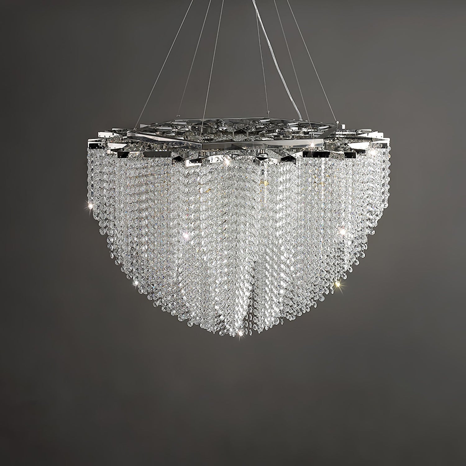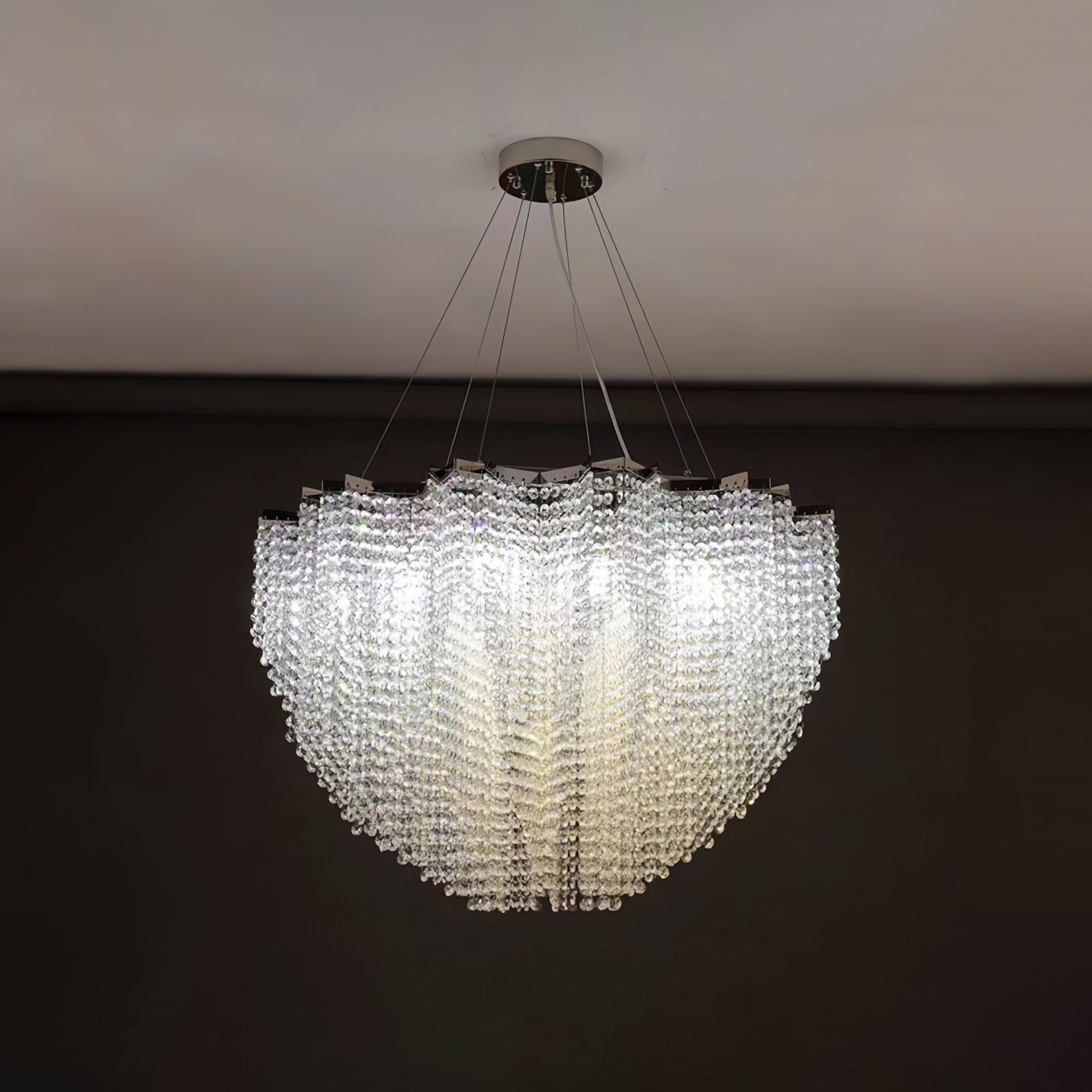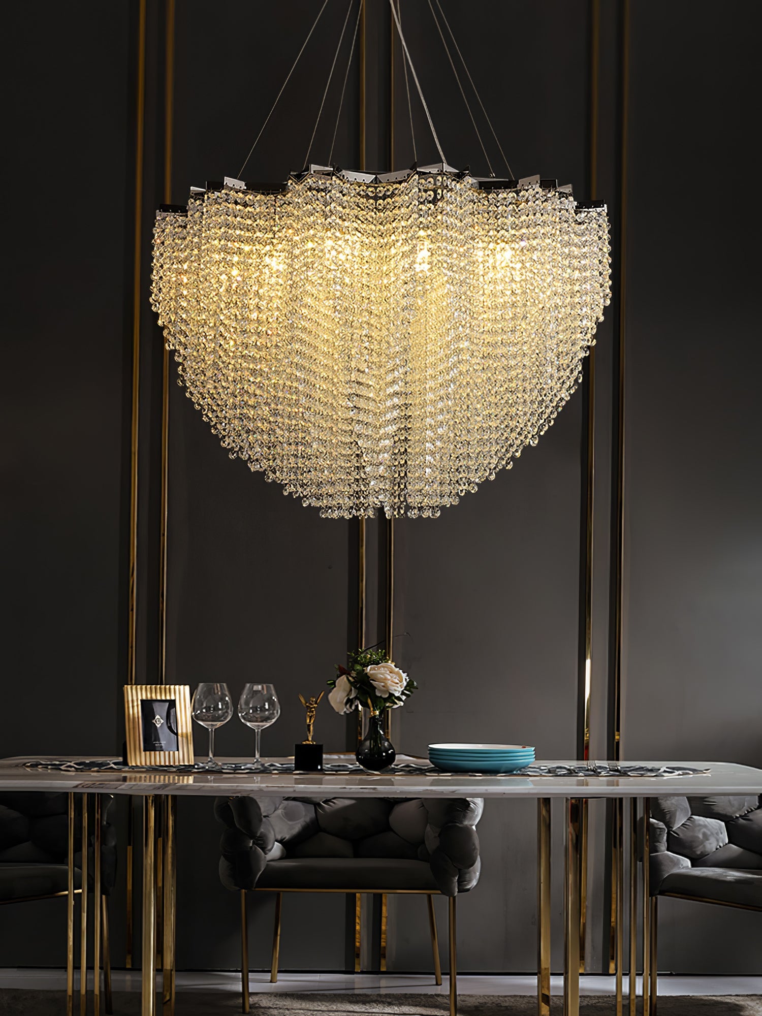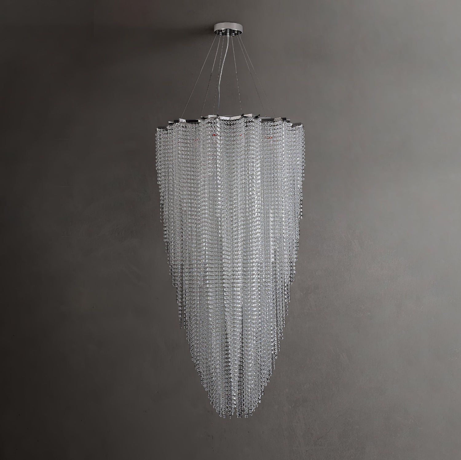 The Stalizi Crystal chandelier features a stunning cascading waterfall of crystal chains, offering a luxurious and dynamic aesthetic. Its cloud-shaped frame adds a touch of elegant curves, while the soft and mesmerizing light creates a dazzling array. Perfect for high-ceilinged areas, from staircases to dining rooms, and commercial spaces.