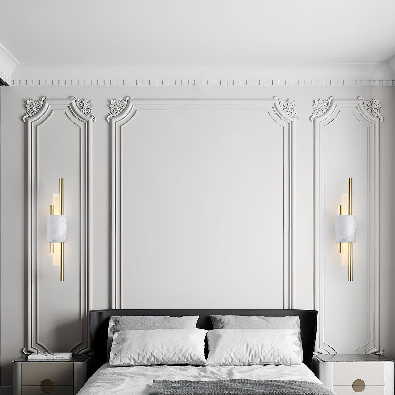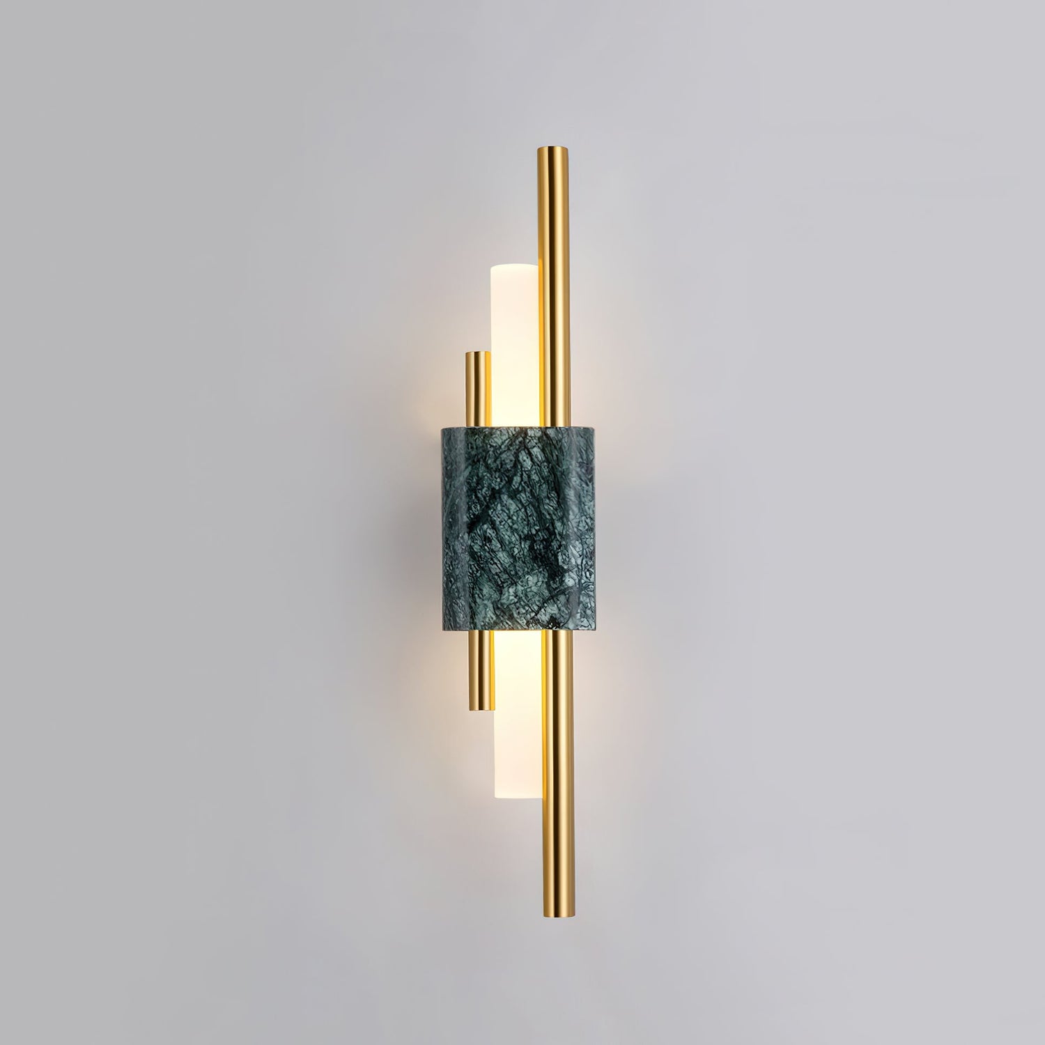 Slimline yet dynamic, the Tanto Wall Light combines two asymmetric brass rods and a central cylindrical opal lamp. Connected together by a marble front it makes quite the stylish statement on any wall.