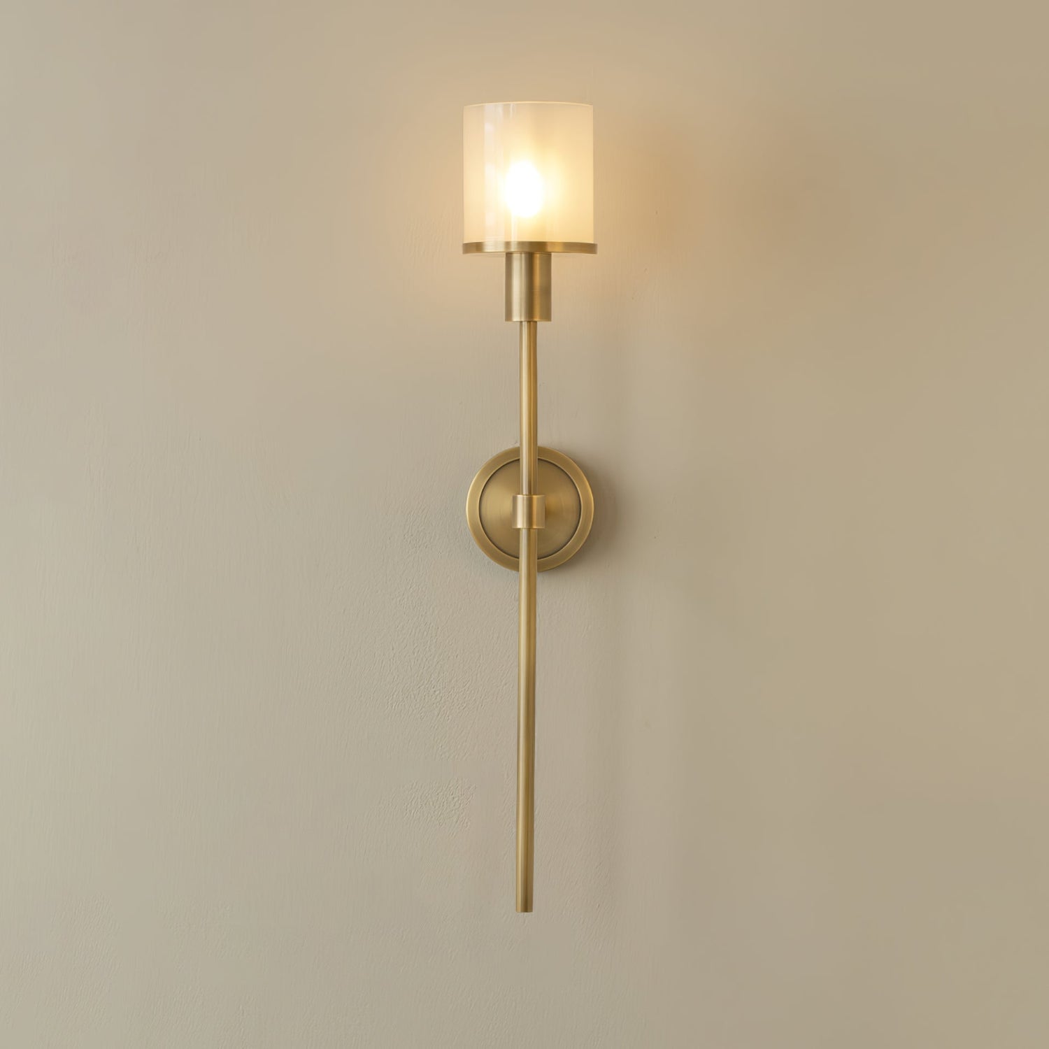 The Tracie Classic Sconce features a transitional glass and metal design, perfect for both office and bathroom installations. Its cylindrical shade, paired with various metal finishes, provides a soft diffused light, creating a serene atmosphere. With a moisture-resistant rating, it is ideal for dual placement on either side of a bathroom vanity.