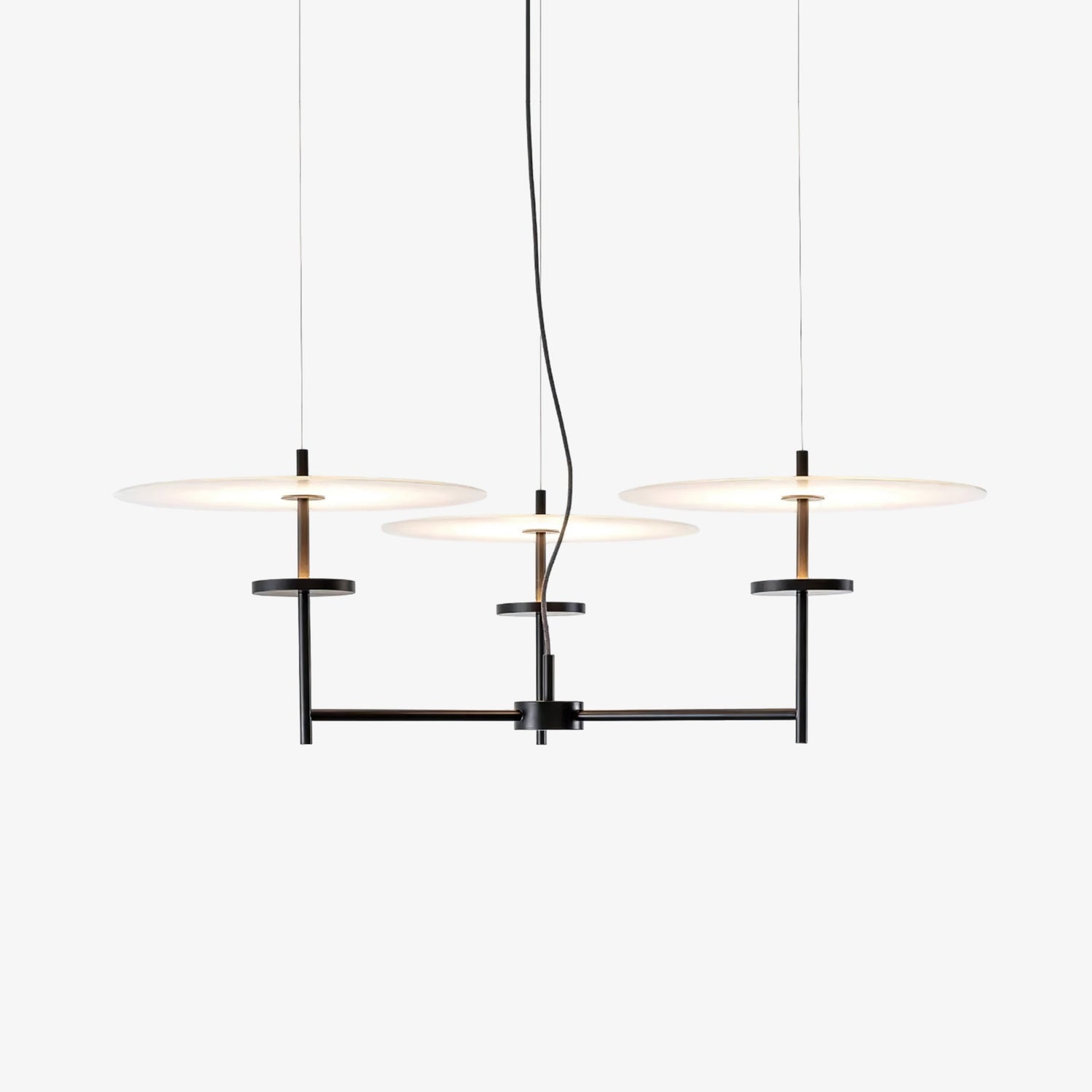 Illuminate your space with the Trezzero Chandelier. The disk-shaped lampshade mimics a solar eclipse, providing a unique and artistic touch. The sleek black brackets and warm lighting bring balance and beauty to modern spaces. Bring the beauty of light and shadow to your home with this stunning chandelier.