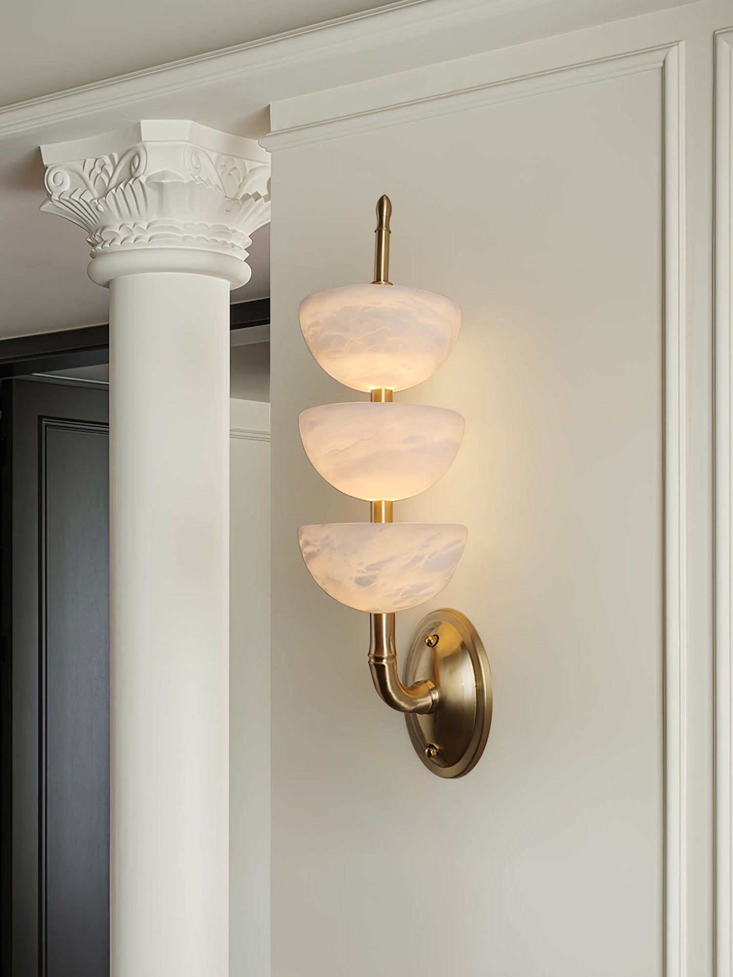 The Triple Alabaster Wall Sconce exudes elegance with its blend of snowflake stone and metal. Featuring three beautifully crafted alabaster shades, this sconce emits a soft, diffused light that creates a serene ambiance. The brass metal frame complements the natural patterns of the alabaster, making it a stylish and sophisticated addition to any room. Inspired by the timeless beauty of alabaster and the warmth of brass, this sconce is perfect for enhancing hallways, living rooms, or bedrooms with a touch of luxury and tranquility.