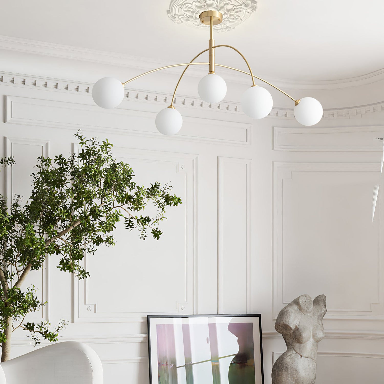 The Valentina Arc Chandelier is a modern lighting fixture that combines spherical and arched design elements. Its versatile design complements any interior and adds a stylish touch above a table or any focal point. Enhance your space with this on-trend piece.