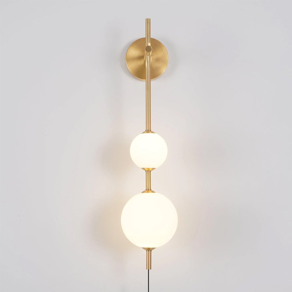 Add stylish lighting to any space with this Vertical Globe Wall Lamp. This sconce makes a welcome addition to your indoor lighting. It features a fixed wall-mounted design with a brass body in abrassfinish for a glam, minimalist look. The spherical shades in a matte white finish diffuse light with a warm, cozy glow, while the dimmable light setting allows you to control the right level of light. Just fix it in your bedroom, hallway, study, or next to your bathroom mirror for effective lighting.This lamp will effortlessly elevate your space. Get yours today and experience the convenience of plug-in lighting!
