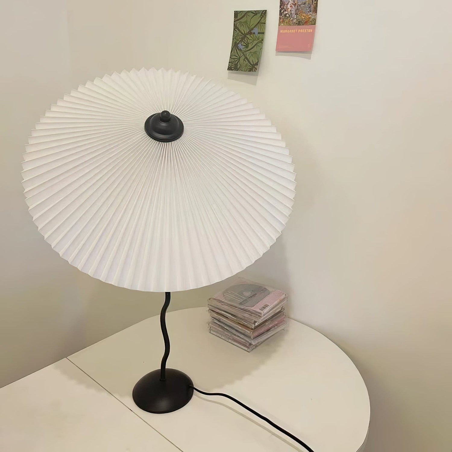 Wiggly Pleated Table Lamp is manufactured using traditional techniques, machinery, and expertise to produce a quality, crisp, sharp / knife-edged pleated lampshade, where much of the finishing work and all the assembly is done by hand. The lampshade fabric has a fire-resistant inner plastic lining and is mounted onto a white lacquered copper wire inner clip frame with a clear perspex backplate, and a black lacquered plastic finial at the top.