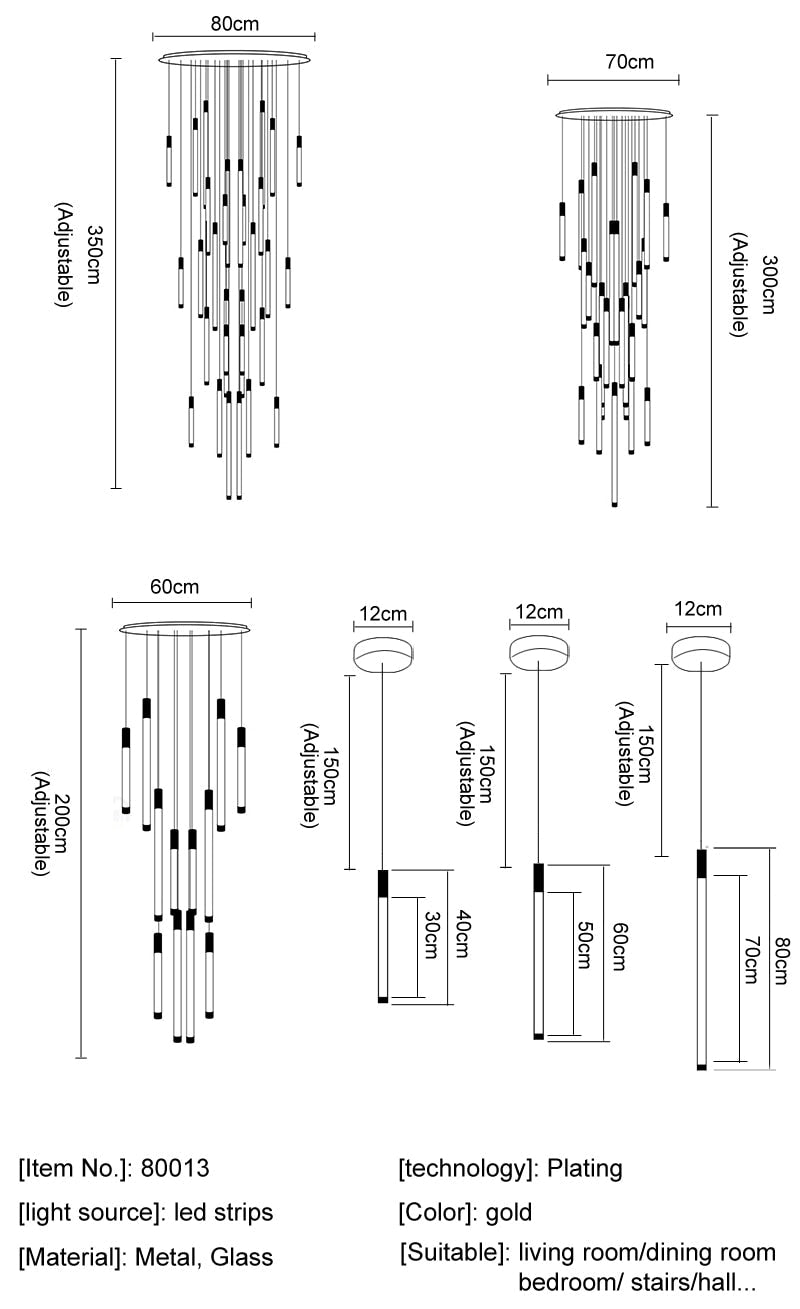 Crafted for versatility, the chandelier features customizable settings with dimmable options, effortlessly adapting to your mood or occasion. Picture the gentle glow of warm white light enveloping your living room, or the crisp, cool white illuminating your staircase with a chic vibrance. Its minimalist, shadeless design elegantly showcases the architectural beauty of your surroundings while creating an inviting atmosphere that beckons both relaxation and celebration.