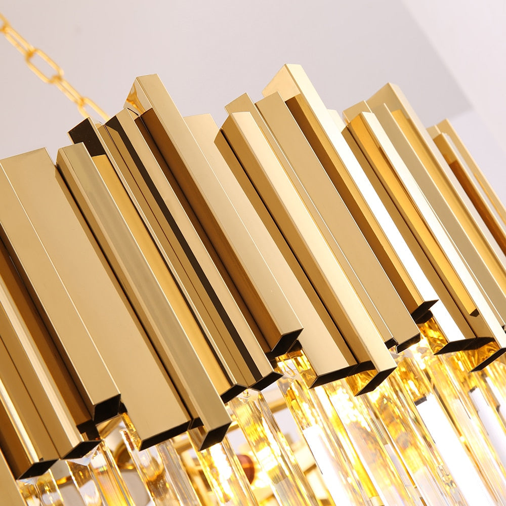 Elevate your living space with the Ylk Sol Modern Crystal Chandelier, a stunning centerpiece that embodies the elegance of Nordic design. This exquisite light fixture exquisitely blends high-quality crystal with a brushed gold finish, creating a luxurious aura that captures both light and attention. With its meticulous craftsmanship, each crystal facet dances with brilliance, reflecting an array of colors that transform your room into a haven of sophistication and style.